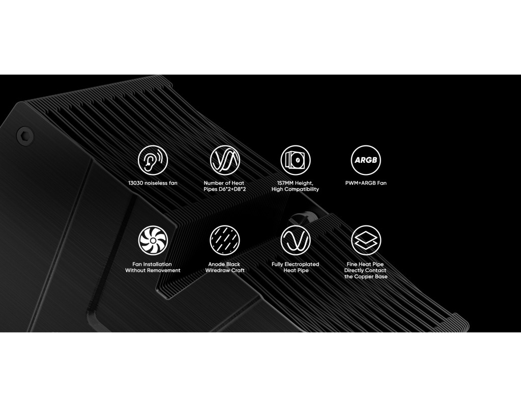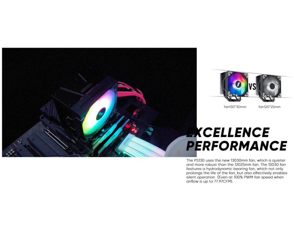 Кулер для процесора 1stPlayer PS130 — це високопродуктивне рішення для повітряного охолодження, яке поєднує передові технології, стильний дизайн і ефективність. Оснащений чотирма тепловими трубками діаметром 6 та 8 мм із чистої міді, він забезпечує відмінне відведення тепла від процесора. Радіатор з електрофоретичним покриттям стійкий до корозії, а його конструкція зміщена для сумісності з високопрофільною оперативною пам’яттю. Кулер має 130-мм вентилятор із гідравлічним підшипником, який працює на швидкості 1600 об/хв, забезпечуючи повітряний потік до 78 CFM і рівень шуму до 32.3 дБ. Вентилятор оснащений ARGB-підсвічуванням із керуванням через 4-контактний роз’єм, що додає естетичності системі. Кулер підтримує широкий спектр сокетів: Intel LGA 1851/1700/1200/1150/1151/1155/1156 та AMD AM4/AM5, з TDP до 230 Вт, що робить його придатним для потужних ігрових і робочих систем. Компактні розміри забезпечують сумісність із більшістю корпусів. Цей кулер ідеально підходить для користувачів, які шукають потужне охолодження з сучасним дизайном. |
