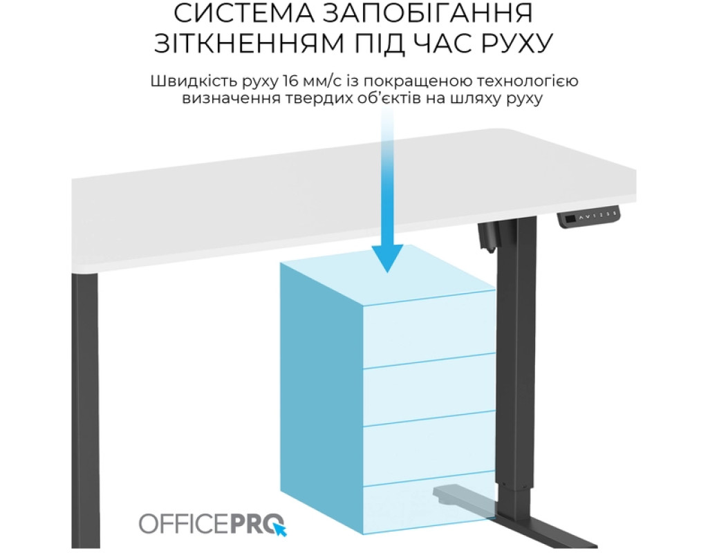 Потужні підйомні колони забезпечують тихий, плавний рух. Система запобігання зіткненням виявляє об’єкти на шляху руху, щоб запобігти зіткненням. Проста у користуванні панель керування дозволяє легко регулювати висоту, а програмовані налаштування пам’яті зберігають улюблені налаштування для додаткової зручності.