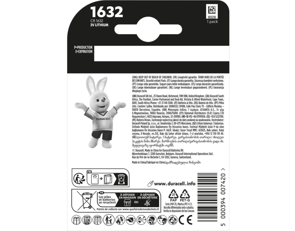 Спеціальні літієві батарейки типу «таблетка» Duracell CR 1632 мають гарантовано довгий термін служби у ваших спеціалізованих пристроях. Для забезпечення безпеки ваших дітей вони спроектовані з упаковкою Baby Secure, яка має подвійний блістер, що важко відкрити без ножиць. Вони підходять для використання в автомобільних ключах, в різних видах пультів дистанційного керування, фітнес-годинниках та інших носимих пристроях, калькуляторах, камерах, сенсорах, автомобільних сигналізаціях, медичних пристроях (глюкометрах, цифрових термометрах). З гарантією зберігання до 10 років, ви можете бути впевнені, що вони будуть готові до використання, коли вони вам знадобляться. |