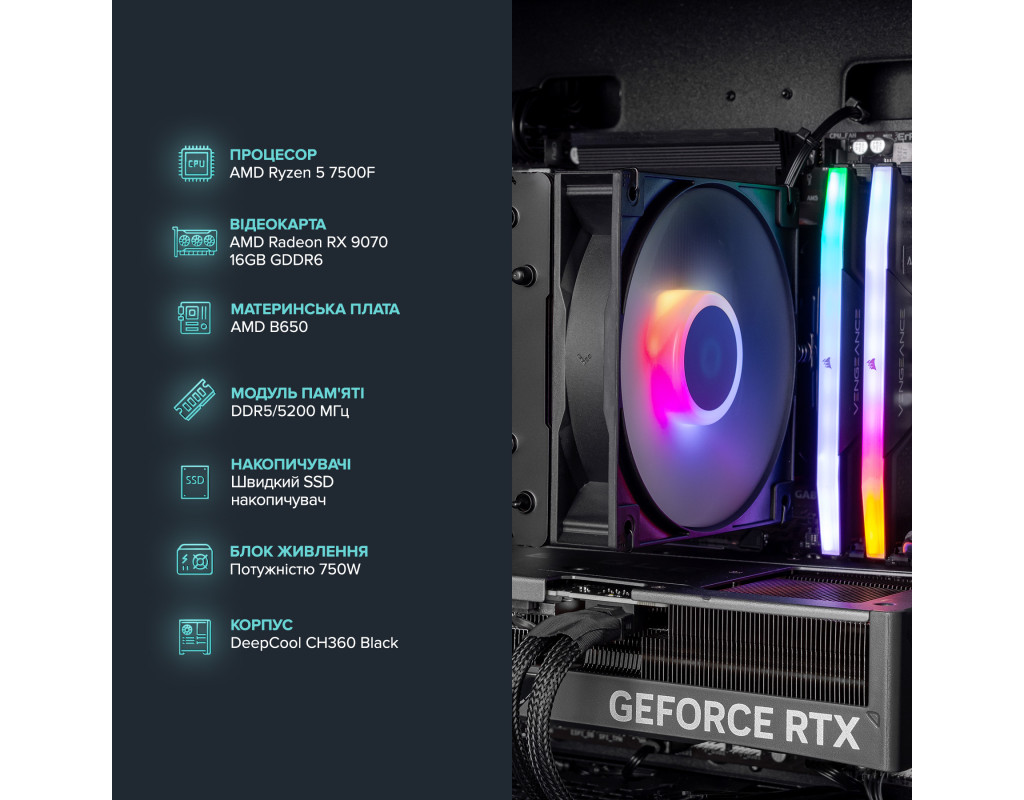 Персональний комп`ютер ASGARD Muninn (A75F.32.S20.97.10047); AMD Ryzen 5 7500F (3.7 - 5.0 ГГц) / ОЗП 32 ГБ / SSD 2 ТБ / AMD Radeon RX 9070 16 ГБ / без ОП / LAN / Wi-Fi / Bluetooth / Fedora / чорний