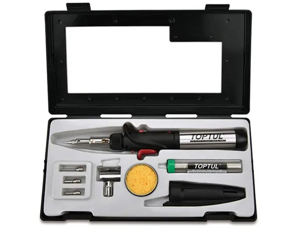 Легкий газовий паяльник TOPTUL EGAE0801 призначений для паяння, розтоплення, різання термочутливих матеріалів, видалення фарби з невеликих поверхонь. Працює на рідкому очищеному бутані, який заправляється в резервуар 15 мл. Такого об'єму бутану вистачає на 75 хвилин інтенсивної роботи на максимальних параметрах або на 90 хвилин на мінімальних. Миттєве п'єзозапалювання за 45 секунд нагріває насадку до 550 °C. Температура відкритого вогню 1300 °C, гарячого повітря 600 °C. За 17 хвилин робоча насадка охолоджується. Постачається в пластиковій коробочці з практичним набором насадок і аксесуарів. Спаяти, розігріти тонкі пластмасові та металеві предмети, зробити так, наприклад, щоб ізоляційна обмотка зсілася, розрізати шкіру, вирізати на дереві, приклеювати різні паєтки, намисто — все це й багато іншого можна зробити за допомогою газового паяльника. Заправляється звичайним газом для запальничок. |