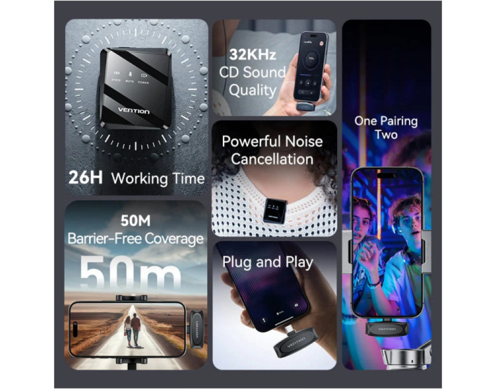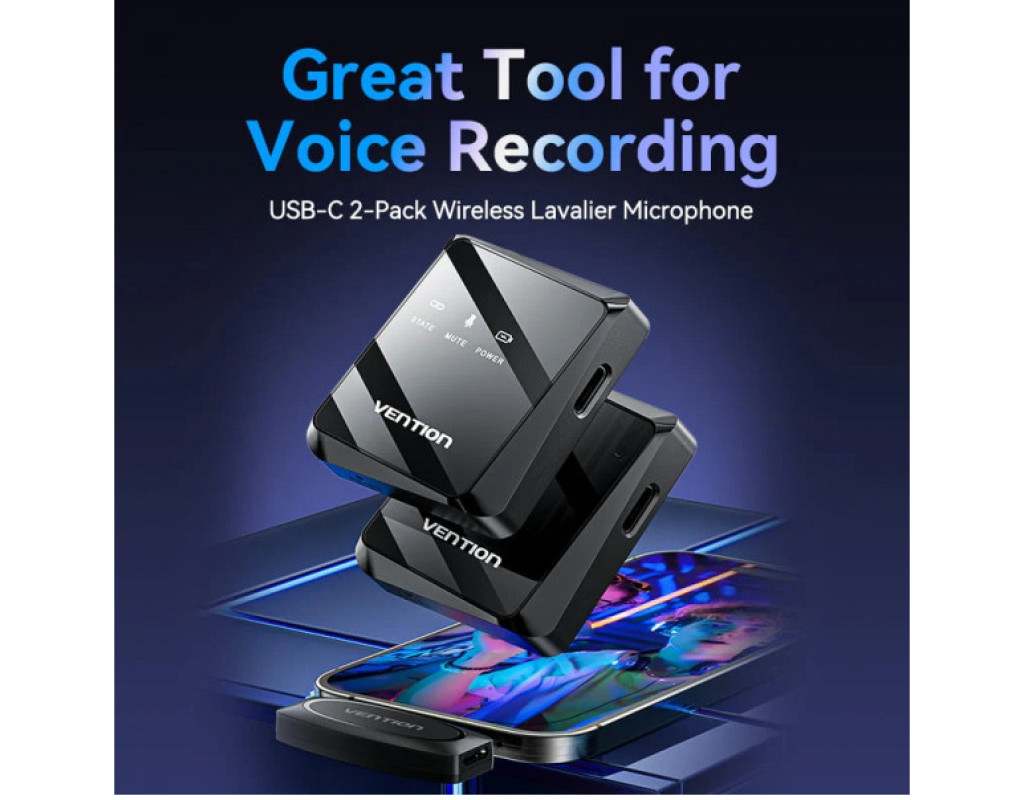 Бездротовий подвійний петличний мікрофон Vention USB-C 2-Pack Wireless Lavalier Microphone - чудовий інструмент для запису звуку. Зручне кріплення робить мікрофон комфортним для тривалих інтерв’ю, запису потокового відео, подкастингу та інших потреб. Мікрофон працює з частотою дискретизації 32 кГц та низькою затримкою – всього 20 мс. Розумне шумозаглушення ефективно зменшує сторонній шум та робить запис чітким та чистим. Вбудований інструмент IEM дозволяє перевірити якість звуку навіть у шумному середовищі. Мікрофон Vention USB-C 2-Pack Wireless Lavalier Microphone підключається за допомогою бездротової технології передачі сигналу 2.4 ГГц через USB-C ключ та підтримує роботу на відстані до 50 м у середовищі без перешкод. USB-C ключ оснащений вхідним портом USB-C, отже ви зможете заряджати свій смартфон при записі аудіо. Вбудований акумулятор ємністю 400 мА*г забезпечує мікрофону до 26 годин автономної роботи. Підтримка функції Plug and Play дозволяє розпочати запис відразу після підключення. Мікрофон Vention USB-C 2-Pack Wireless Lavalier Microphone сумісний з із комп’ютерами, телефонами, камерами та іншими пристроями. |