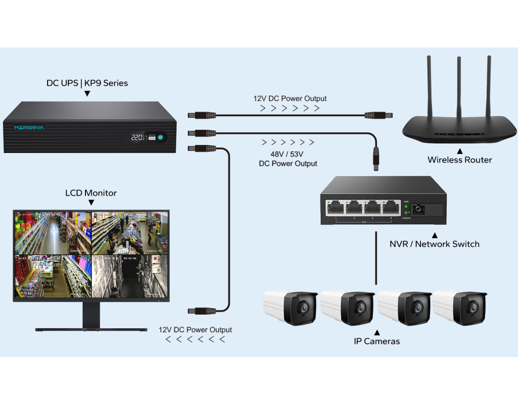 | ДБЖ Marsriva DC UPS KP9 Pro 12xDC+PoE24VGigabit1A+USB, 14V/16V/19V/24V/48V/53V 240VAC 100W 24000mAh |