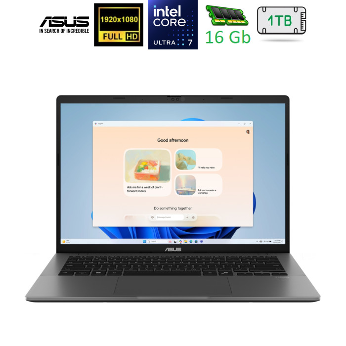 Інтелектуальний, ефективний, захищений Відкрийте для себе сучасні технології для ефективної роботи з ASUS Vivobook S14, ідеальним компаньйоном для повсякденного життя. Цей витончений і стильний ноутбук стане надійним помічником у роботі, навчанні та розвагах. Оснащений у максимальній конфігурації процесором Intel Core Ultra (Series 2) та акумулятором ємністю 70 Вт*год, який забезпечує до 20 годин автономної роботи, він гарантує високу продуктивність у будь-якій ситуації. Його металевий корпус є водночас стильним і практичним, а яскравий IPS-дисплей із роздільною здатністю Full HD та якісна аудіосистема зроблять відеоконференції та перегляд відео ще більш захопливими. ASUS Vivobook S14 створений для комфортної роботи та насолоди кожною миттю! Створений для життя Мінімалізм зовні, максимум потужності всередині. ASUS Vivobook S14 – ультратонкий, легкий ноутбук із дизайном, у якому переважають чіткі лінії, і продуктивністю, яка дійсно вражає. Мінімалістська естетика робить його ідеальним доповненням до будь-якого стилю життя, а преміальний логотип, вигравіруваний на кришці за допомогою верстату з ЧПК, додає нотку вишуканості та елегантності. Насолоджуйтеся бездоганною портативністю й вишуканим стилем без жодних компромісів щодо швидкодії. Для цілодобового використання З ноутбуком ASUS Vivobook S14 ви завжди будете готові до роботи! Від світанку до заходу сонця і навіть довше – цей пристрій готовий до будь-яких викликів завдяки акумулятору високої ємності (70 Вт*год), що забезпечує повний день автономної роботи для роботи та розваг. Більше захисту, менше турбот Підвищте рівень конфіденційності за допомогою функції розпізнавання обличчя Windows Hello для входу в систему, яка працює швидко та надійно. Пристрій забезпечує посилений захист від нових загроз, де б ви не були – вдома, на роботі чи в дорозі. Ідеальне поєднання Насолоджуйтеся справжнім комфортом завдяки інтеграції функцій ноутбука та смартфона для здійснення дзвінків, написання повідомлень і доступу до файлів за допомогою технології Microsoft Phone Link. Ця технологія покращує взаємодію різних платформ, об’єднуючи всі ваші пристрої в єдину уніфіковану систему. Більше занурення IPS-дисплей зі співвідношенням сторін 16:10, роздільною здатністю Full HD і матовим покриттям забезпечує чітке, яскраве зображення для комфортного перегляду вмісту. Цей дисплей пропонує розширений робочий простір та якісне зображення для комфортної роботи, продуктивного навчання та захопливих розваг. Більше портів, менше клопоту ASUS VivoBook S14 пропонує повний набір портів для підключення будь-яких периферійних пристроїв. Забудьте про надокучливі перехідники та адаптери – підключайте свої пристрої без проблем. Цей пристрій створений для мобільного життя. Великий інтуїтивний тачпад Тачпад зі збільшеною поверхнею, ніж у попередньої моделі, відповідає пропорціям дисплея. У поєднанні з підтримкою інтелектуальних жестів це полегшує взаємодію з ноутбуком. Надійна конструкція, бездоганне виконання Ноутбуки ASUS відзначаються підвищеною надійністю, підтвердженням чого є успішне проходження ними випробувань на відповідність військово-промисловому стандарту MIL-STD 810H. Такі випробування містили перевірку працездатності в найсуворіших умовах експлуатації. Ці якості, у свою чергу, подовжують термін служби пристроїв, а отже, позитивно впливають на екологію, т