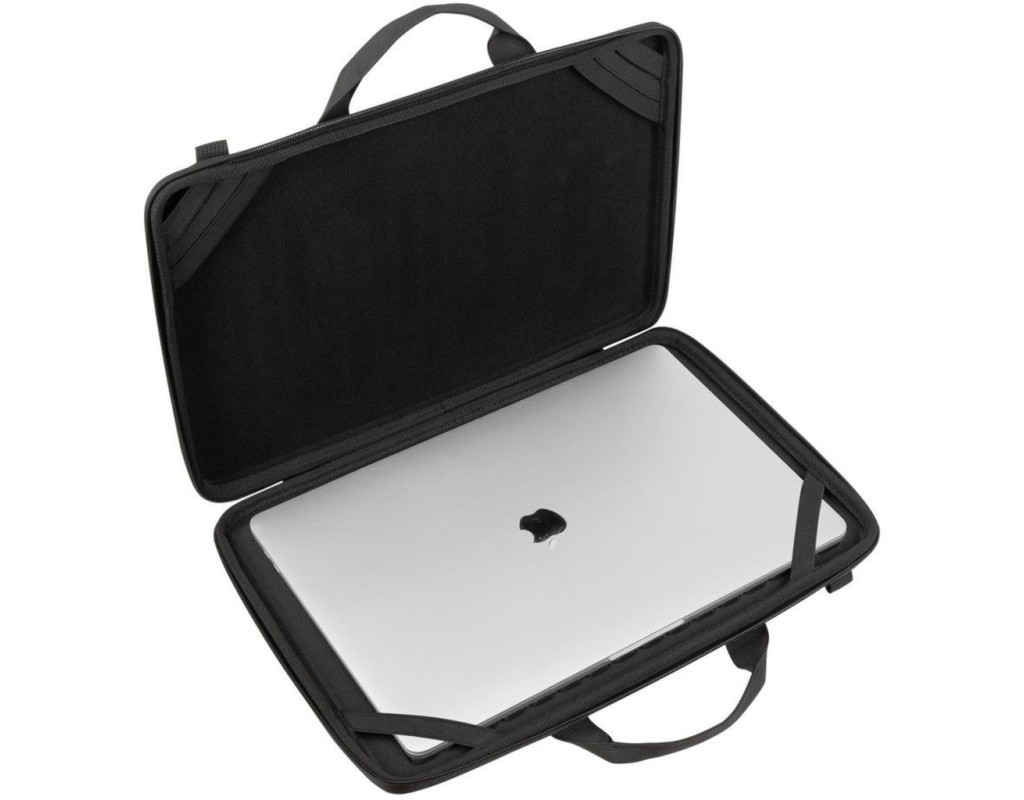 - Ноутбук надійно кріпиться всередині чохла спеціальними фіксувальними стрічками по кутах