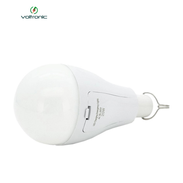 Emergency Bulb: - Модель: Emergency Bulb - Джерело живлення: Два акумулятори 18650 – це типові літій-іонні акумулятори, які використовуються для забезпечення енергією портативних пристроїв. - Потужність: 20 Ватт (20W) - це вказує на споживану потужність лампочки, що впливає на яскравість світла, яку вона виробляє. - Упаковка: Box - це означає, що лампочка поставляється в коробці, що може включати додаткові аксесуари або документацію.