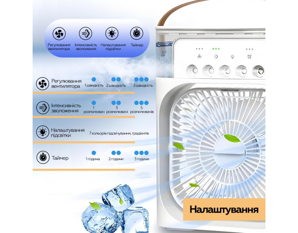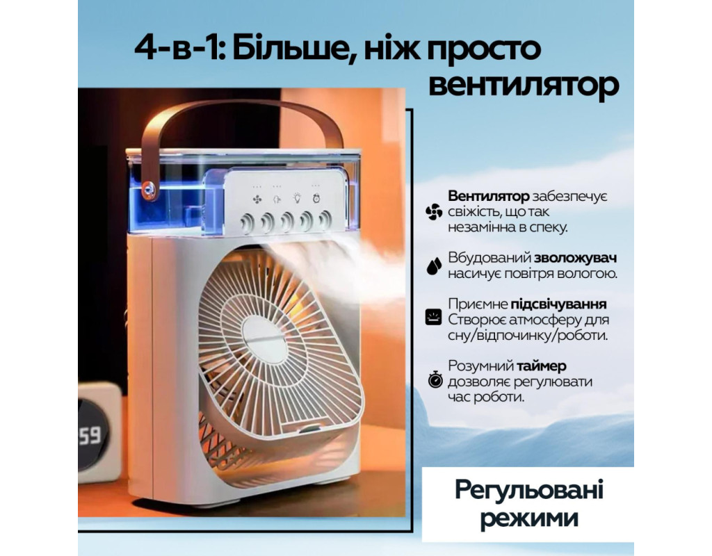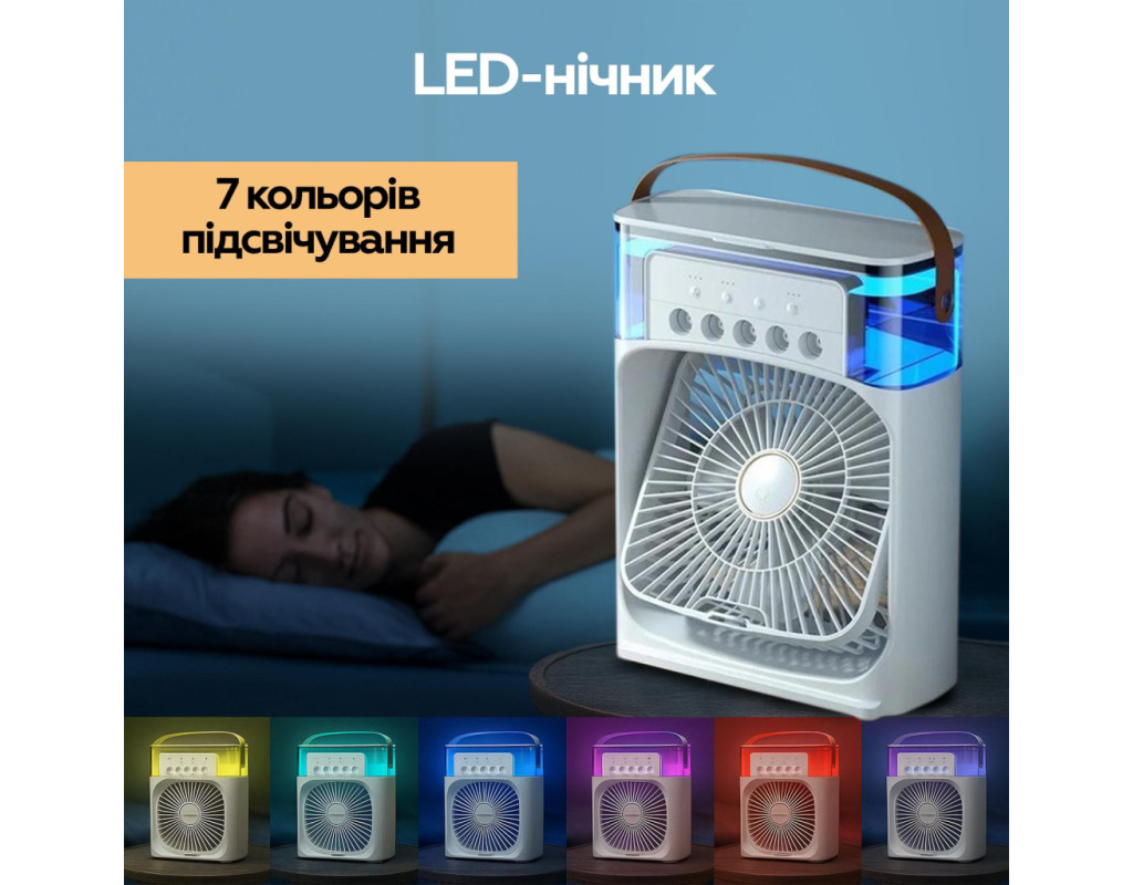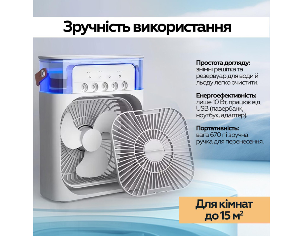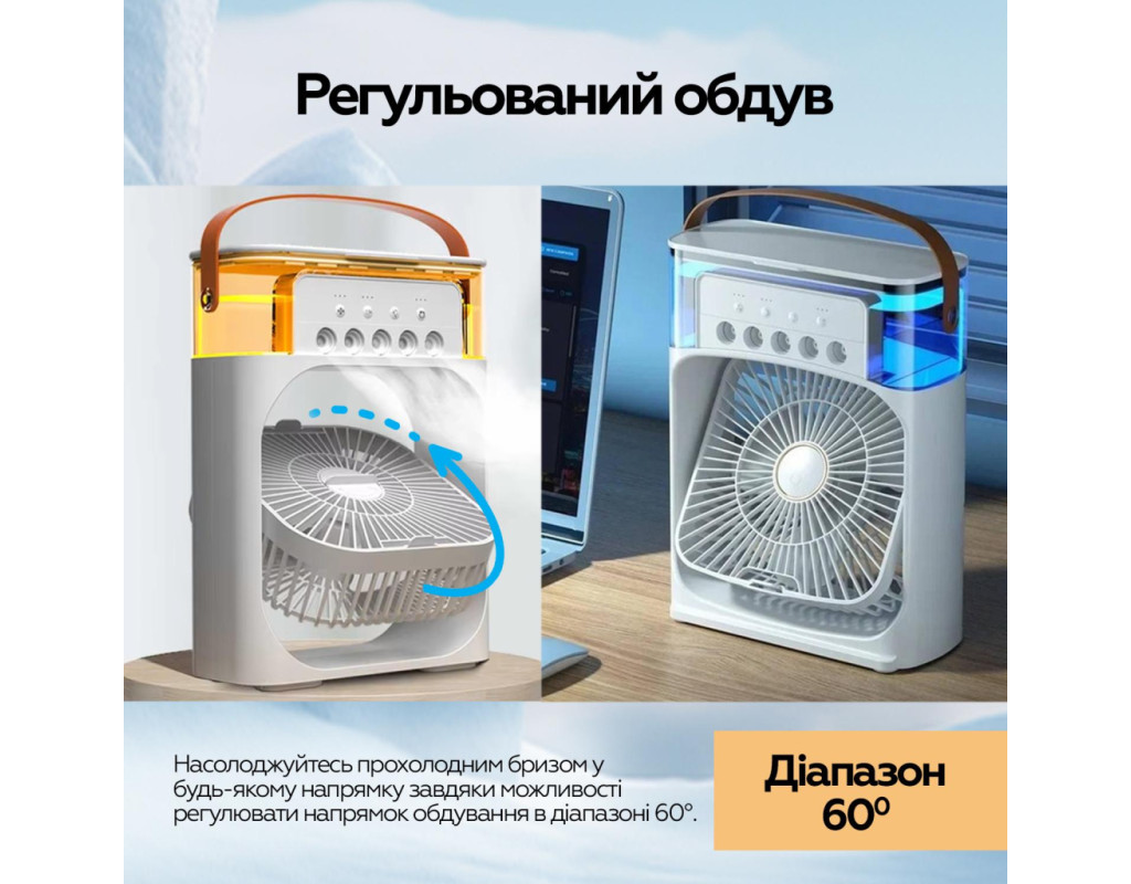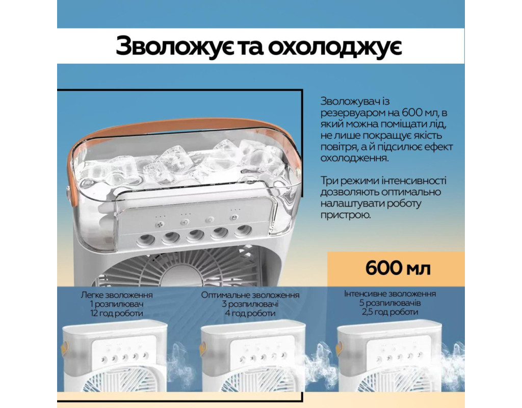 | Портативний вентилятор + Зволожувач повітря, це не тільки персональний портативний охолоджувач повітря для охолодження влітку, але і зволожувач повітря, арома-терапевтичний апарат навесні, восени і взимку. Це корисно цілий рік. Підходить для спальні, кухні, офісу, GYM, подорожей тощо. Супер великий резервуар для води на 600 мл. Не потрібно часто міняти воду, можна додавати воду або кубики льоду в резервуар, 5 розбризкувачів великого калібру. Повний резервуар води може зволожувати повітря безперервно протягом 4,5-12 годин. За бажанням можна додати таблетки для ароматерапії