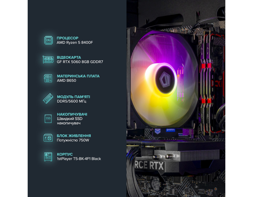 Персональний комп`ютер ASGARD (A84F.32.S10.56.5944); AMD Ryzen 5 8400F (4.2 - 4.7 ГГц) / ОЗУ 32 ГБ / SSD 1 ТБ / NVIDIA GeForce RTX 5060 8 ГБ / без ОП / LAN / Wi-Fi / Bluetooth / Linux / чорний