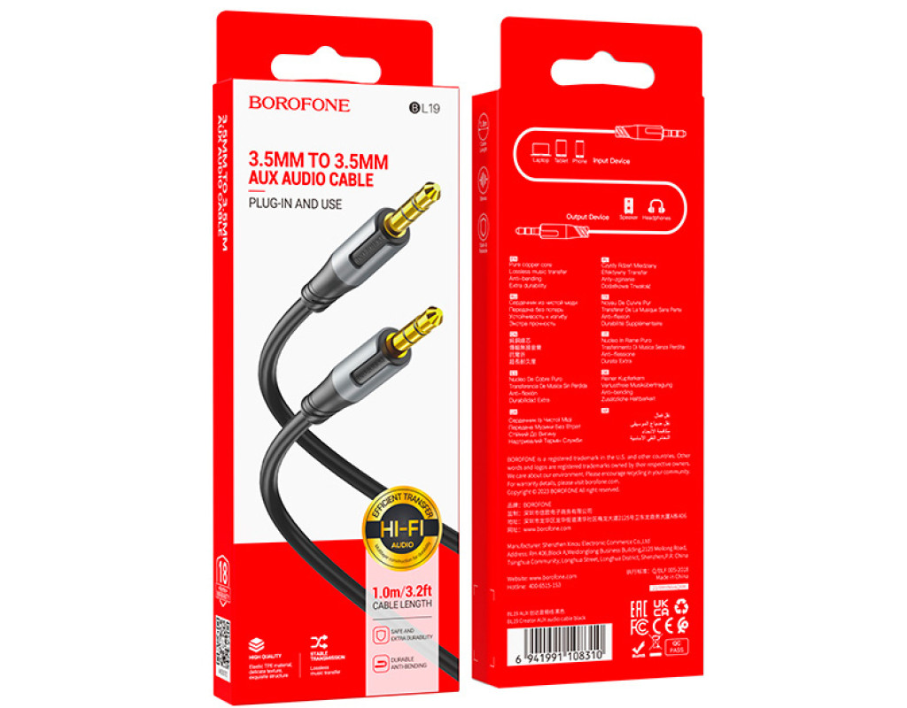 Кабель BOROFONE BL19 з двома конекторами 3.5 mm jack дозволяє підключати навушники, портативні колонки та інші пристрої, що відтворюють звук, до інших пристроїв. Цей кабель забезпечує високу швидкість обміну сигналами та надійність у роботі. Оболонка кабелю виготовлена з міцного матеріалу, який забезпечує довговічність виробу, не допускає зношування кабелю, виключаючи пошкодження та злами. Достатня довжина 1 м дозволяє зручно розмістити пристрої відносно один одного. |
