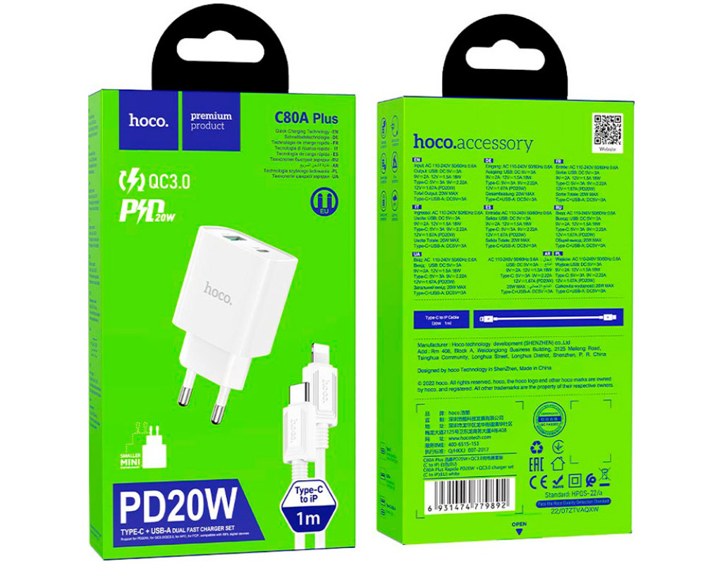 | Зарядний пристрій HOCO C80A Plus Rapido — це ідеальне рішення для сучасних гаджетів, яке поєднує в собі якість, швидкість і безпеку. Завдяки ергономічному та універсальному дизайну, цей адаптер легко поміститься в кишеню чи сумку, ставши вашим надійним супутником під час поїздок. Виготовлений з високоякісного вогнестійкого полікарбонату, цей зарядний пристрій демонструє високу стійкість до перегріву, що значно підвищує його довговічність. Підтримка технологій швидкої зарядки, таких як Power Delivery 3.0, Programmable Power Supply (PPS) і Quick Charge 3.0, забезпечує не тільки швидкість, але й безпеку під час зарядки. Максимальна потужність у 20 Вт і загальний струм 3.1 А гарантують швидке поповнення енергії в смартфонах, планшетах, смарт-годинниках та інших пристроях. Пристрій оснащений двома портами: одним USB Type-C та одним USB, що дозволяє одночасно заряджати два пристрої, надаючи вам безпрецедентну гнучкість. Завдяки продуманому розташуванню виходів зверху корпусу, зарядка стає ще зручнішою. У комплекті йде надійний USB-C to Lightning кабель довжиною 1 метр, який забезпечує бездоганне з'єднання з Apple-пристроями. Завдяки своїй універсальності та функціональності, HOCO C80A Plus Rapido стане ідеальним рішенням для будь-яких ситуацій, забезпечуючи безперебійну роботу ваших улюблених гаджетів. |