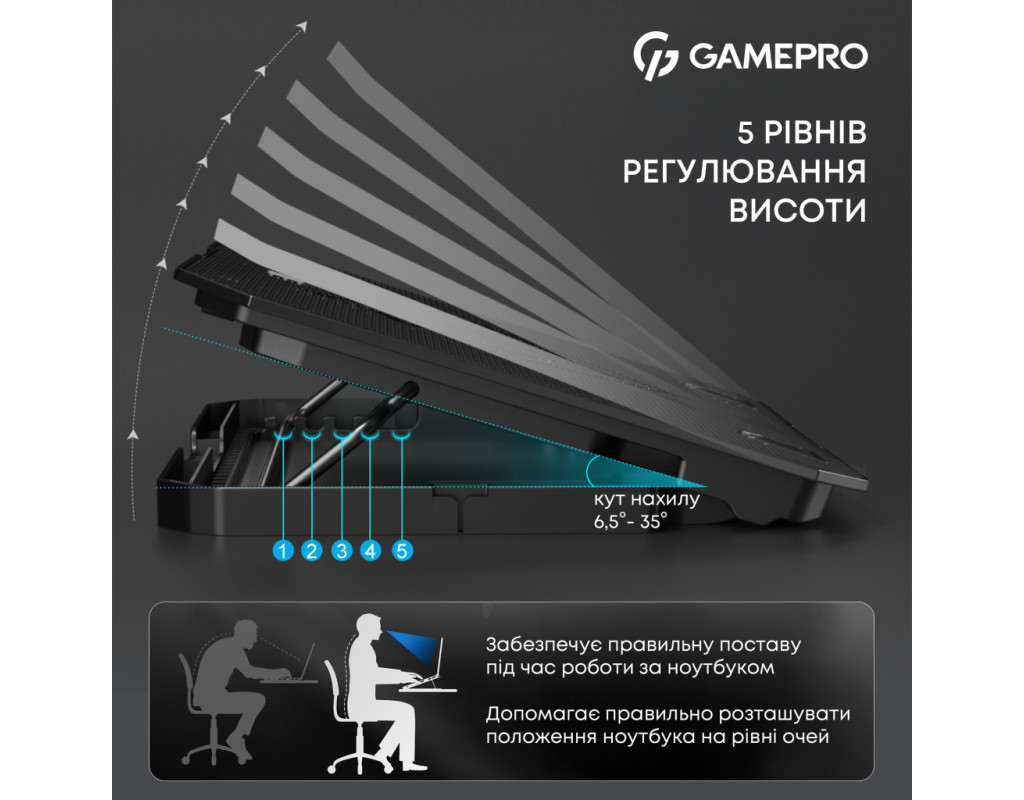 Охолоджуюча підставка для ноутбука Gamepro CP350 оснащена двома великими вентиляторами розміром 125 х 125 х 15 мм, які працюють на швидкості до 1000 обертів за хвилину. Це означає, що вони здатні забезпечити ефективне охолодження вашого ноутбука, уникаючи перегріву та зберігаючи його продуктивність на високому рівні. Вам доступні п'ять різних налаштувань висоти, щоб забезпечити найзручніше положення для використання. Чи ви працюєте за столом, чи на дивані - ця підставка легко пристосується до вашого стилю. Підставка оснащена двома USB-роз'ємами для підключення додаткових пристроїв, щоб забезпечити повну універсальність використання. Та щоб ваш смартфон завжди був під рукою, ви отримуєте невеличкий, але надійний тримач, який може легко вмістити ваш пристрій. Матеріали, використані для створення підставки - це високоякісний АБС-пластик та міцна залізна сітка, що гарантую довговічність і надійність використання. З CP350 кожна ваша робоча або розважальна сесія стане ще комфортнішою та ефективнішою. Лише підключіть, налаштуйте та насолоджуйтеся ідеальним поєднанням функціональності та дизайну. |
