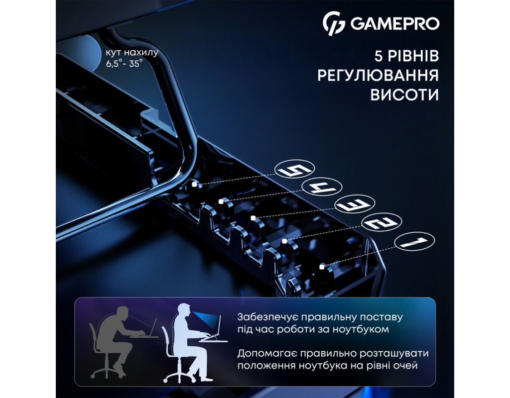 Охолоджуюча підставка для ноутбука Gamepro CP560 оснащена великим вентилятором діаметром в 125 мм, який працює на швидкості 1170 обертів за хвилину. Це як свіжий подих для ноутбука, що забезпечує ефективне охолодження під час тривалої роботи або гри. Та це ще не все! Крім великого вентилятора, є чотири малих вентилятора діаметром 60 мм мм, які можуть працювати на швидкості від 2400 до 3200 обертів за хвилину. Завдяки регулятору швидкості обертання вентиляторів, можна самостійно вибрати оптимальний рівень охолодження відповідно до своїх потреб. Ця підставка також має два USB-роз'єми, що робить її не тільки зручною для використання, але й додатковою станцією для підключення інших пристроїв. А ще вона вражає своєю гнучкістю – 5 рівнів налаштувань висоти дозволяють знайти найзручніше положення для роботи. |