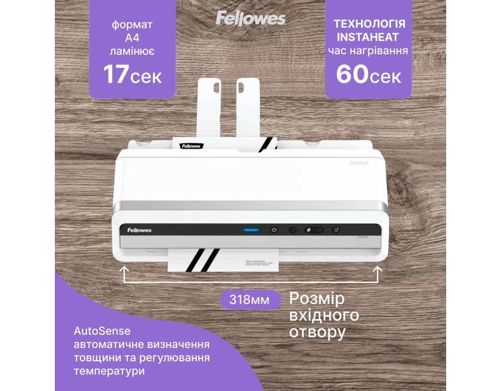 | Fellowes Jupiter A3 - професійний ламінатор для повсякденного використання в середньому офісі. Модель забезпечує високу швидкість, бездоганну якість ламінування та максимальну зручність завдяки інтелектуальним технологіям.
