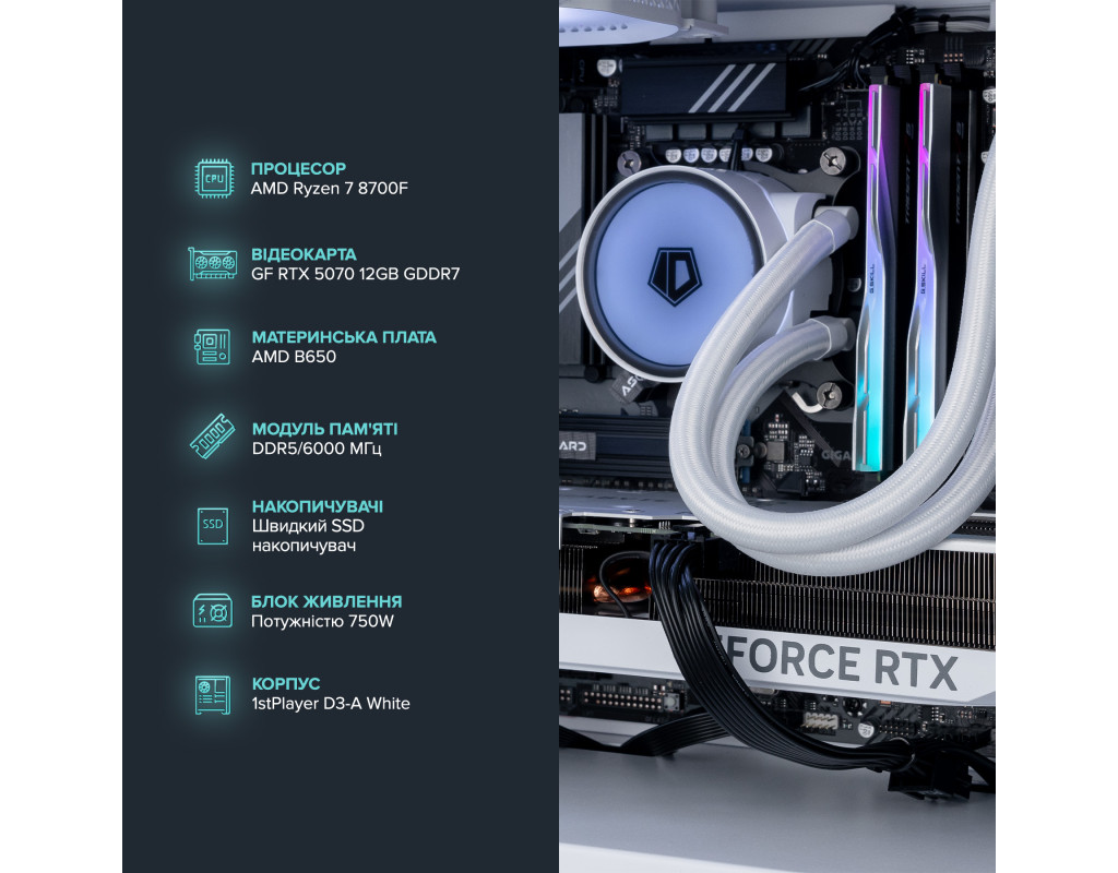 Персональний комп`ютер ASGARD Garm (A87F.32.S20.57.12.5968); AMD Ryzen 7 8700F (4.1 - 5.0 ГГц) / ОЗП 32 ГБ / SSD 2 ТБ / NVIDIA GeForce RTX 5070 12 ГБ / без ОП / LAN / Wi-Fi / Bluetooth / Linux / білий