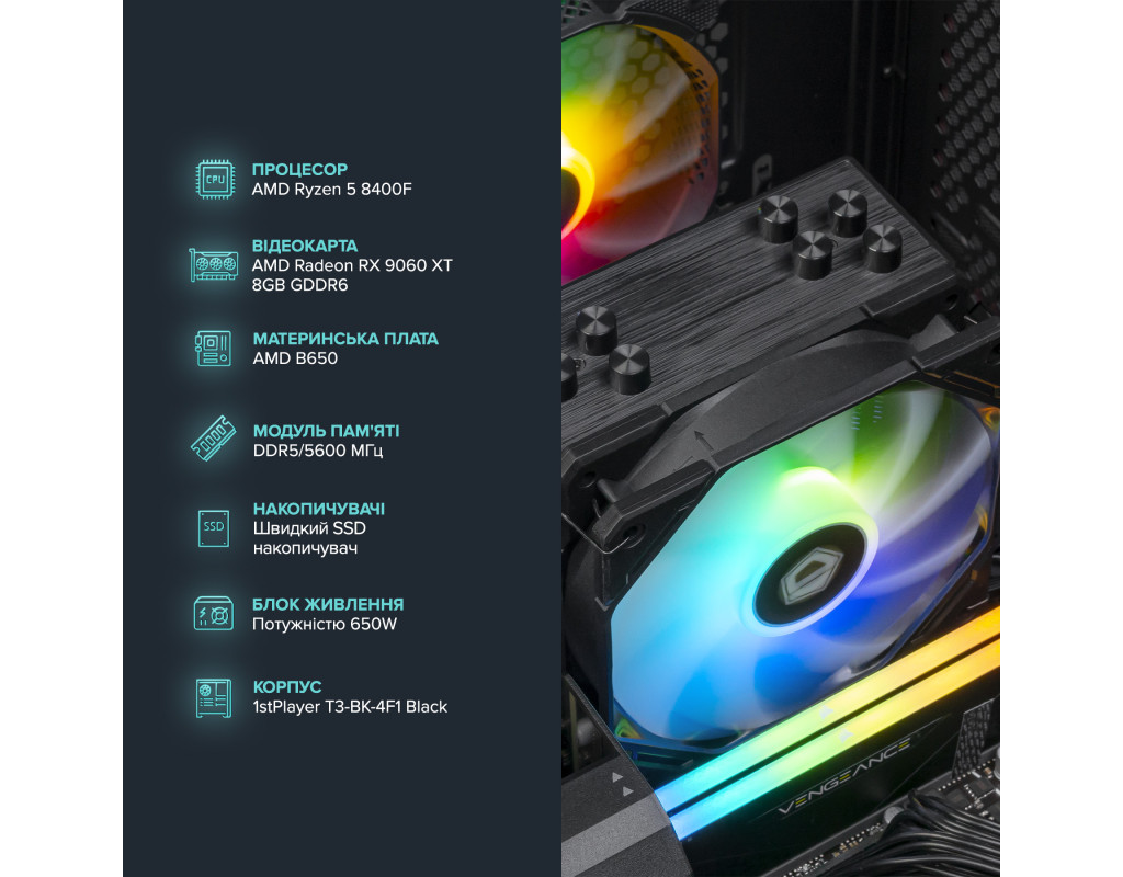 Персональний комп`ютер ASGARD Hel (A84F.32.S10.96XT.8.5973); AMD Ryzen 5 8400F (4.2 - 4.7 ГГц) / ОЗП 32 ГБ / SSD 1 ТБ / AMD Radeon RX 9060 XT 8 ГБ / без ОП / LAN / Wi-Fi / Bluetooth / Linux / чорний