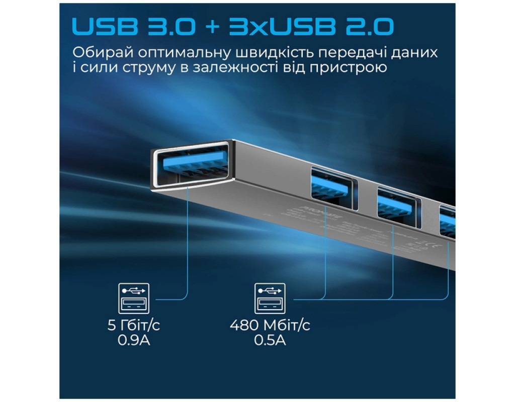 - USB 3. 0 + 3xUSB 2. 0: 5 Гбіт/с і 0. 9А, або 480 Мбіт/с і 0. 5А. Обирай оптимальну швидкість передачі даних і сили струму в залежності від пристрою, що підключається.