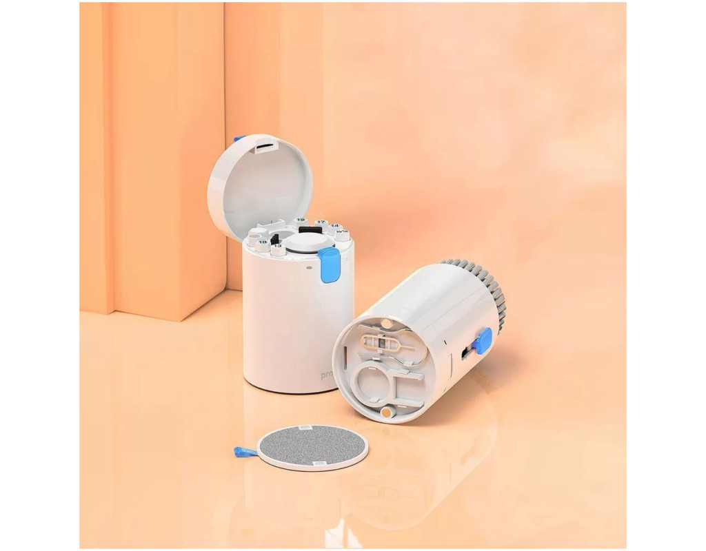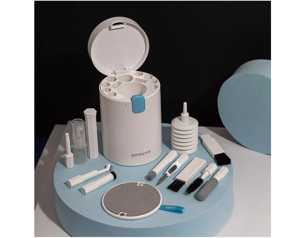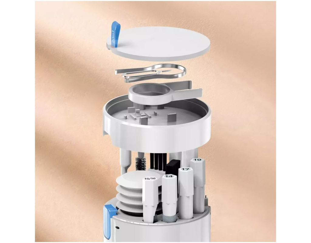 У комплекті: Кейс для зберігання х1, Велика висувна щіточка х1, Мікрофібра для чищення дисплея х1, Пиловидаляч х1, Подовжувач для пиловидаляча (короткий) х1, Подовжувач для аксесуарів х1, Спрей х1, Маленька жорстка щіточка х1, Маленька м'яка щіточка х1, Знімач кнопок клавіатури х1, Голка для виймання SIM-карт х1, Знімач клавіш клавіатури х1, Маленька вигнута щіточка х1, Ватна паличка х1, Щіточка для навушників х1, Наконечник х1, Коротка м'яка щіточка х1, Щіточка для зарядного кейса навушників х1, Щіточка для лінзи камери х1, Подовжувач для пиловидаляча (довгий).