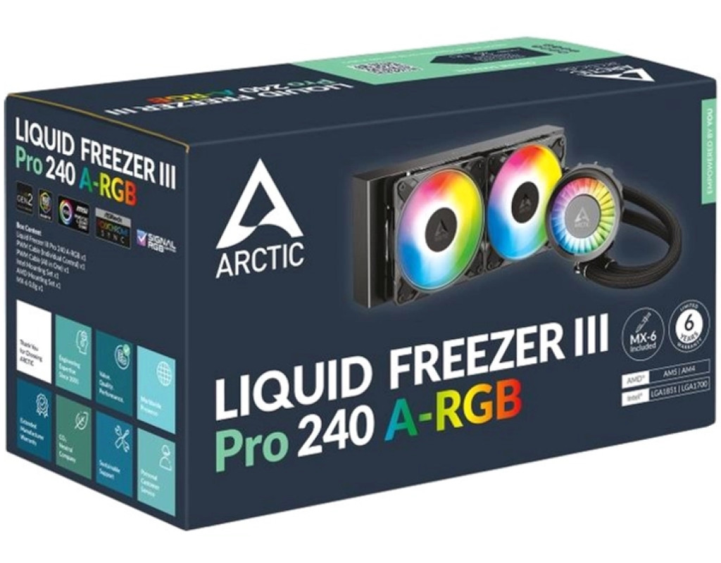 Arctic Liquid Freezer III Pro 240 ARGB — система рідинного охолодження, створена для ефективного охолодження сучасних процесорів Intel і AMD, навіть у компактних корпусах. Завдяки 240-мм радіатору з товщиною 38 мм, вона забезпечує оптимальну тепловіддачу, утримуючи температури CPU на низькому рівні під час високих навантажень. Нова конструкція вентиляторів P12 Pro з сімома лопатями та діапазоном швидкості до 3000 об/хв гарантує високий статичний тиск і ефективне охолодження, залишаючись при цьому тихою. Унікальною особливістю є інтегрований вентилятор VRM на блоці водяного охолодження, який охолоджує зону материнської плати навколо процесора, підвищуючи стабільність системи. Оновлена конструкція насоса працює на швидкості до 2800 об/хв, забезпечуючи швидкий потік охолоджувальної рідини, а продумане розташування кабелів спрощує встановлення. Система підтримує широкий спектр сокетів, включно з LGA1851, LGA1700, AM4 і AM5, а для Intel використовується спеціальна контактна рамка для кращого контакту з процесором. Arctic Liquid Freezer III Pro 240 вирізняється високою продуктивністю та тихою роботою, що робить її ідеальним вибором для геймерів і професіоналів, які шукають надійне охолодження. |