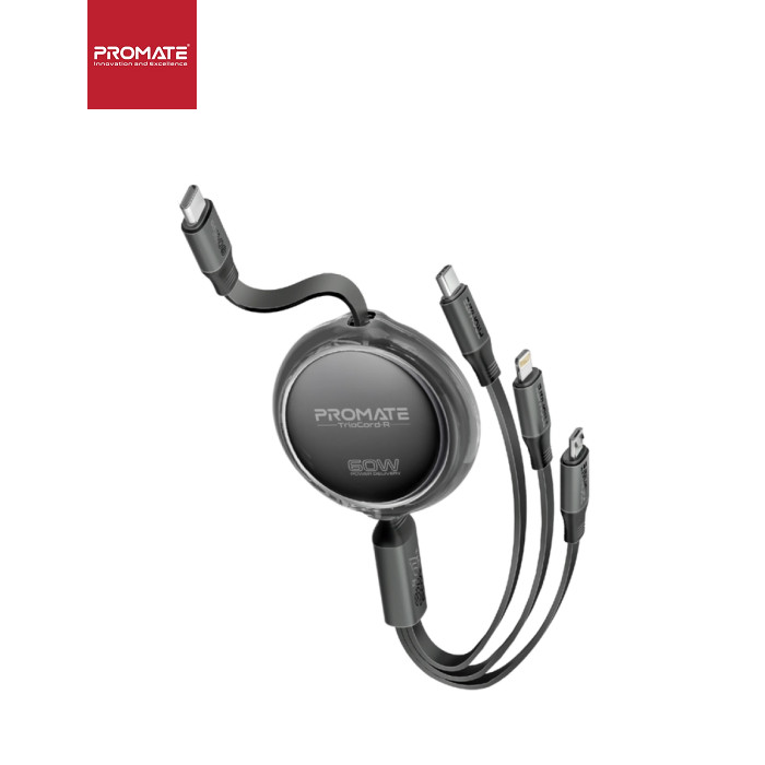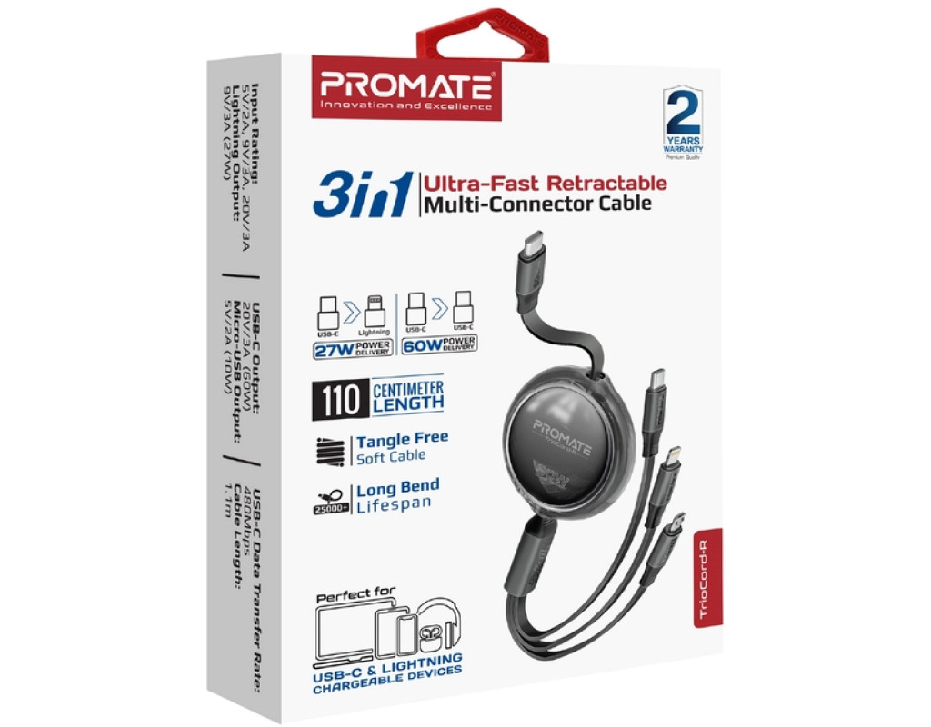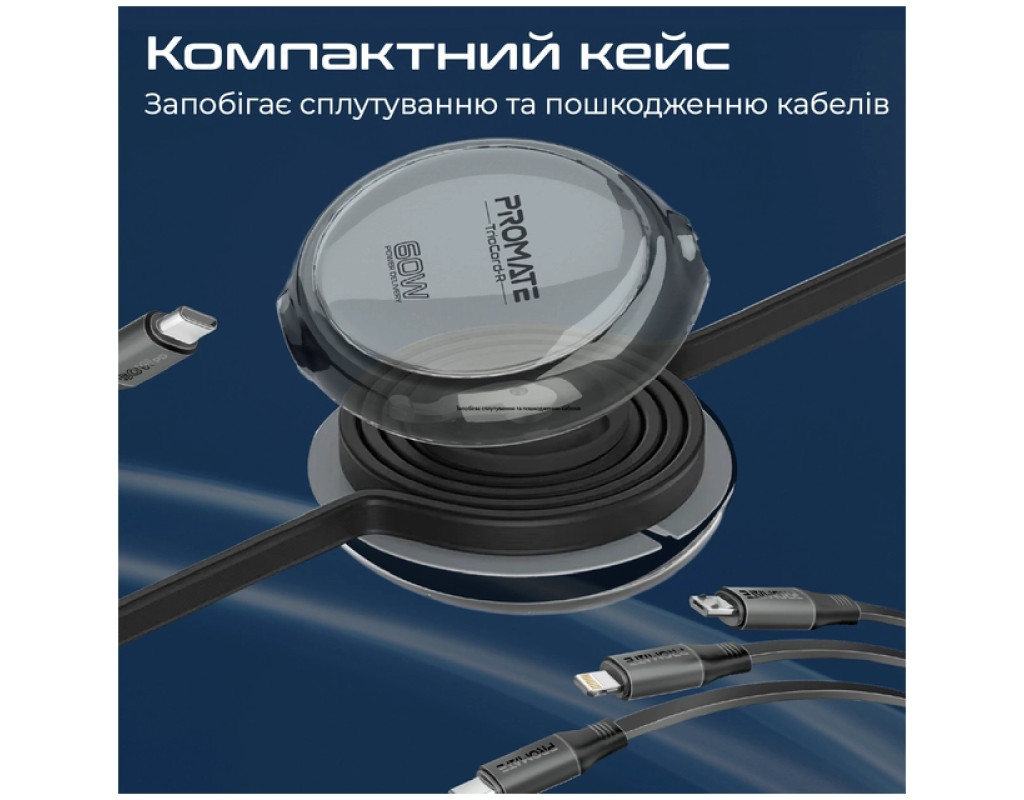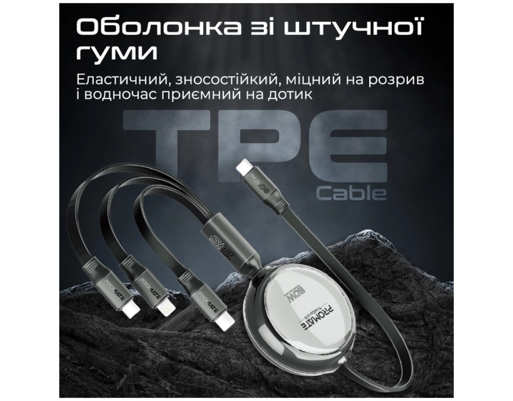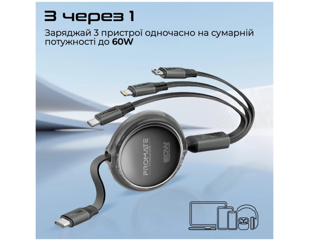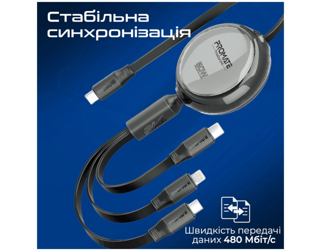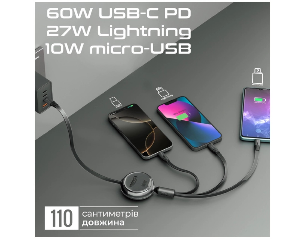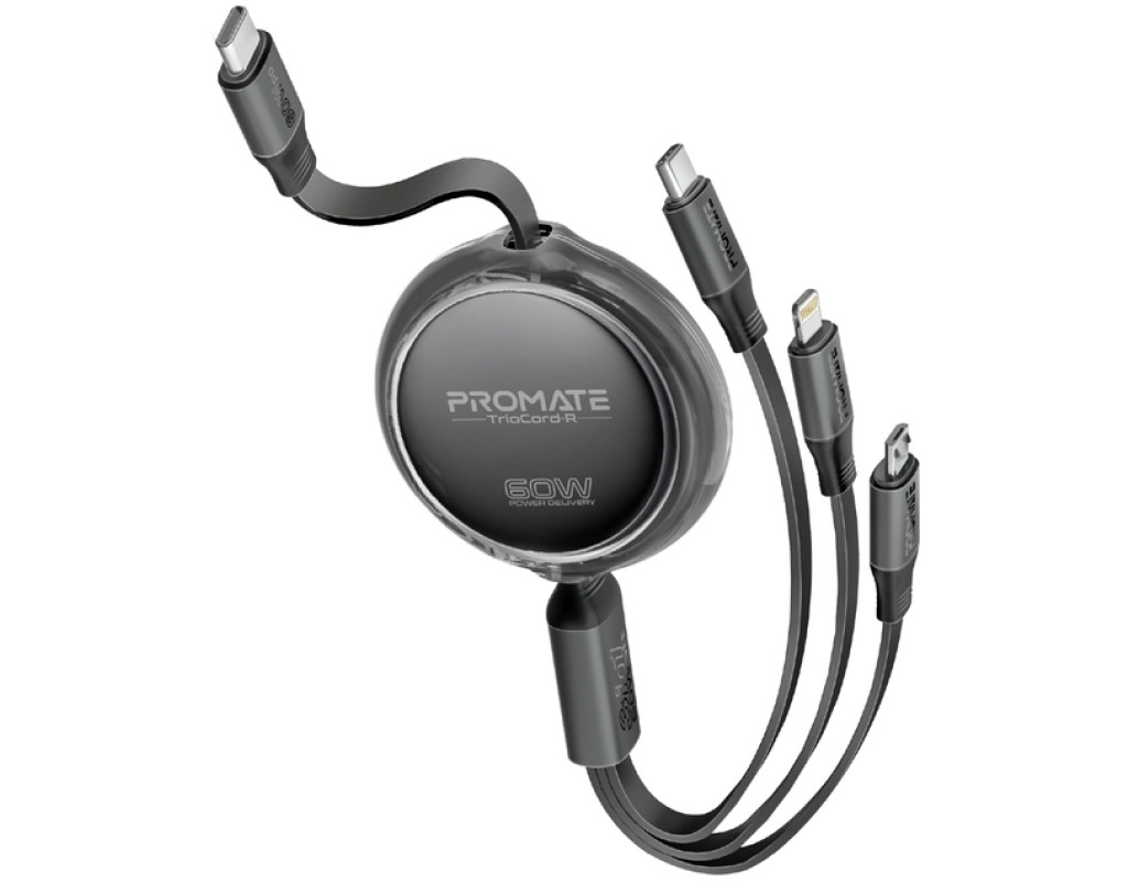 Дата кабель USB-C to Lightning 1.1m 27W + USB-C 60W + Micro USB TrioCord-R black Promate (triocord-r.black)