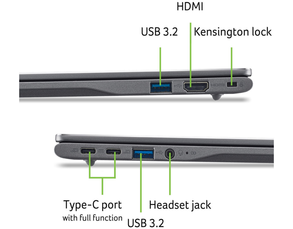 Підключення без обмежень Розроблений для продуктивної роботи цей Chromebook Plus оснащений клавішею швидкої вставки, цифровою клавіатурою, додатковою клавіатурою з підсвічуванням, Wi-Fi 6E, двома портами USB 3.2 Gen 2 Type-C і двома портами USB 3.2 Gen 1 Type-A, а також портом HDMI, щоб ви завжди залишалися на зв'язку та продуктивними.