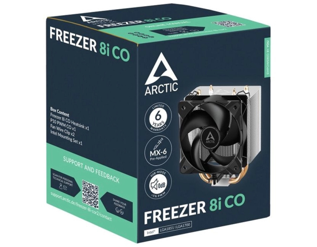 Кулер Arctic Freezer 8i CO для охолодження Intel-процесорів поєднує високу продуктивність та ідеально підходить для компактних систем, забезпечуючи надійне охолодження без зайвого шуму. Завдяки низькопрофільному дизайну з висотою лише 136 мм Freezer 8i CO легко вміщується в невеликі корпуси та не створює проблем із сумісністю з високими модулями оперативної пам’яті чи іншими компонентами. Його конструкція включає дві теплові трубки з прямим контактом і 49 алюмінієвих пластин, які забезпечують оптимальну передачу тепла. Вентилятор діаметром 100 мм із подвійним кульковим підшипником, який гарантує довговічність і стійкість до пилу та високих температур. Завдяки PWM-регулюванню швидкість обертів варіюється від 200 до 2300 об/хв, забезпечуючи тиху роботу під різними навантаженнями. Це робить версію CO ідеальною для серверів або систем, що працюють 24/7. Спеціально розроблений монтажний каркас для сокетів LGA1700 і LGA1851 запобігає деформації процесора, підвищуючи його довговічність. Завдяки оптимізованому розподілу притискного тиску кулер забезпечує тривалий термін служби процесора та стабільне охолодження. |