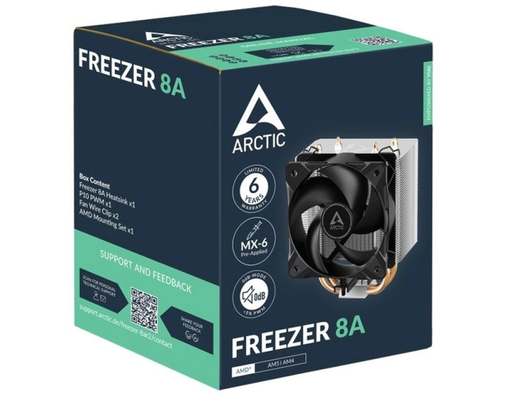 Arctic Freezer 8A — це компактний кулер для процесорів AMD, який є наступником популярного Freezer 7 X. Він призначений для ефективного охолодження CPU середнього та початкового рівня на платформах AM4 і AM5. Завдяки висоті лише 136 мм, кулер ідеально підходить для компактних корпусів, не заважає високим модулям оперативної пам’яті та забезпечує сумісність із сусідніми компонентами. Оснащений двома мідними тепловими трубками діаметром 6 мм із прямим контактом до процесора, Freezer 8A забезпечує ефективне тепловідведення. Оптимізована конструкція з можливістю зміщення радіатора дозволяє краще вирівнювати його відносно гарячої зони CPU, що покращує теплопередачу. Кулер комплектується одним 100-мм вентилятором Arctic P10 PWM із діапазоном обертів від 200 до 2300 об/хв, який підтримує режим повної зупинки (0 дБ) при низькому PWM. Arctic Freezer 8A постачається з попередньо нанесеною термопастою MX-6, що спрощує встановлення та забезпечує високу теплопровідність. Завдяки компактним розмірам і вазі 415 г, він простий у монтажі та не створює навантаження на материнську плату. |