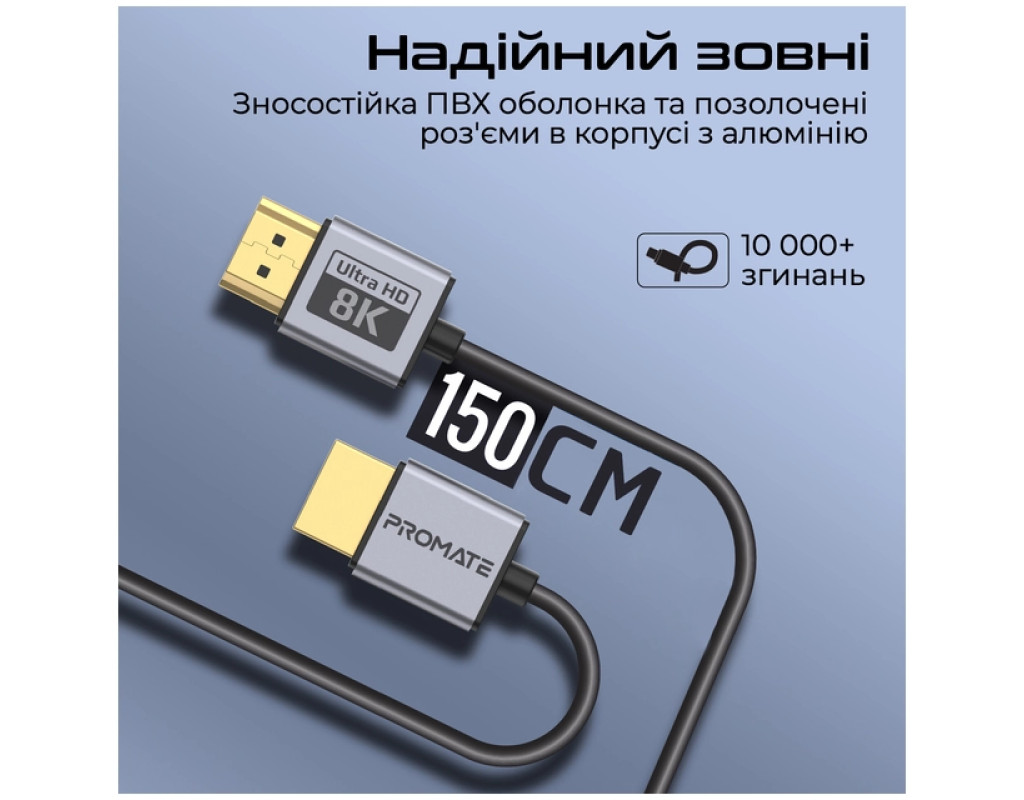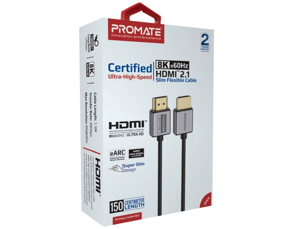 Виводь зображення на зовнішній дисплей у роздільній здатності UHD 8K за допомогою ліцензійного HDMI кабеля Promate PrimeLink8K-150. Особливості: - Гарантована якість: Кабель офіційно сертифікований HDMI® Licensing Administrator, Inc і має відповідну ліцензійну етикетку на упаковці.
