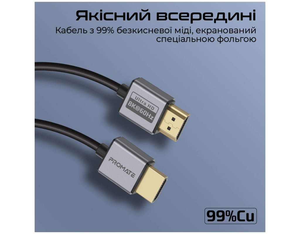 - Якісний всередині: Кабель з 99% безкисневої міді, екранований спеціальною фольгою та позолочені роз'єми в корпусі з алюмінію.