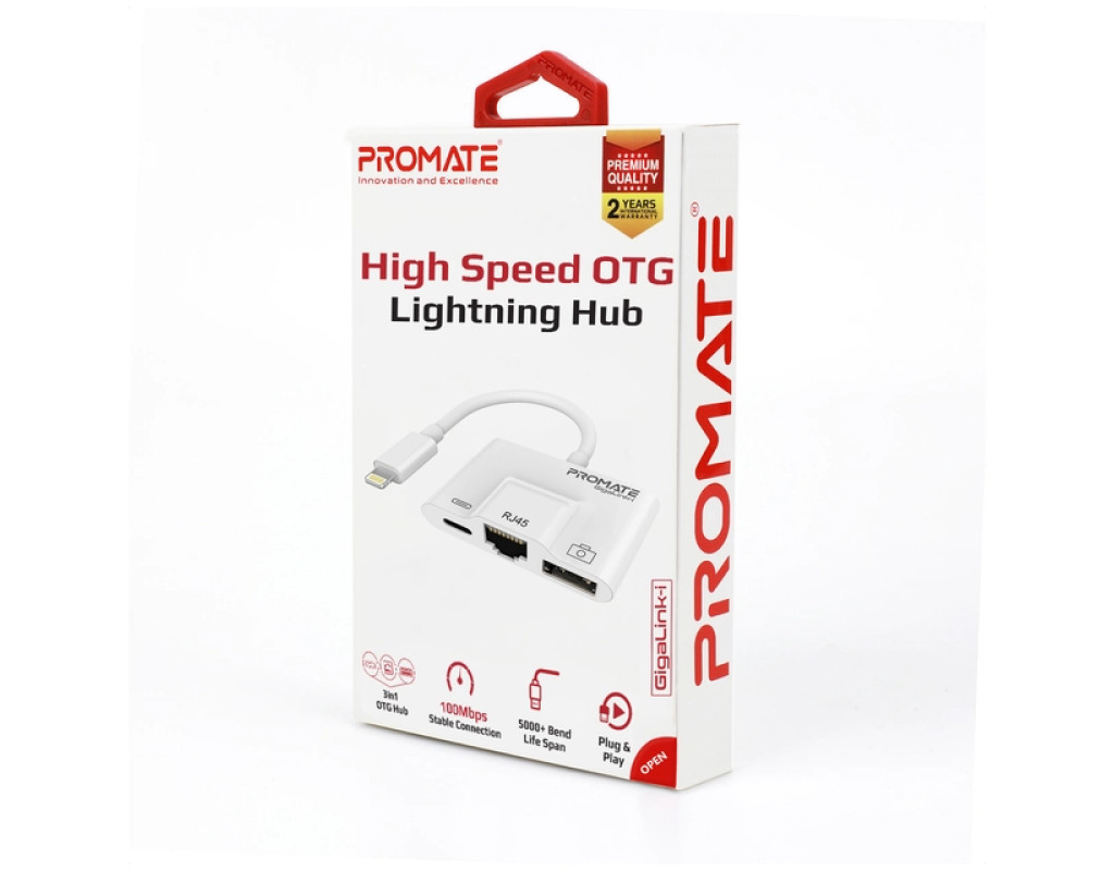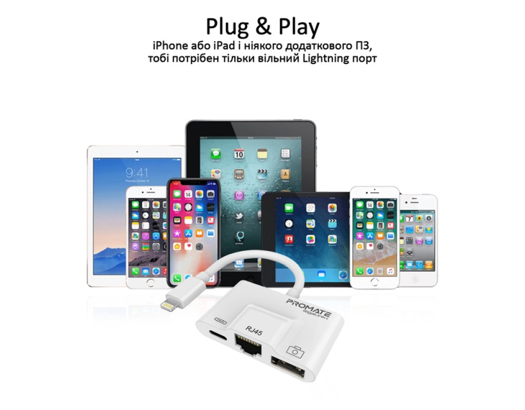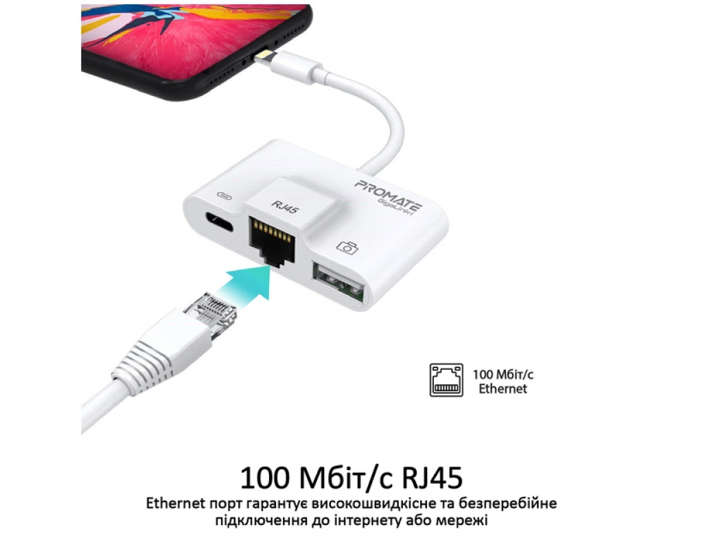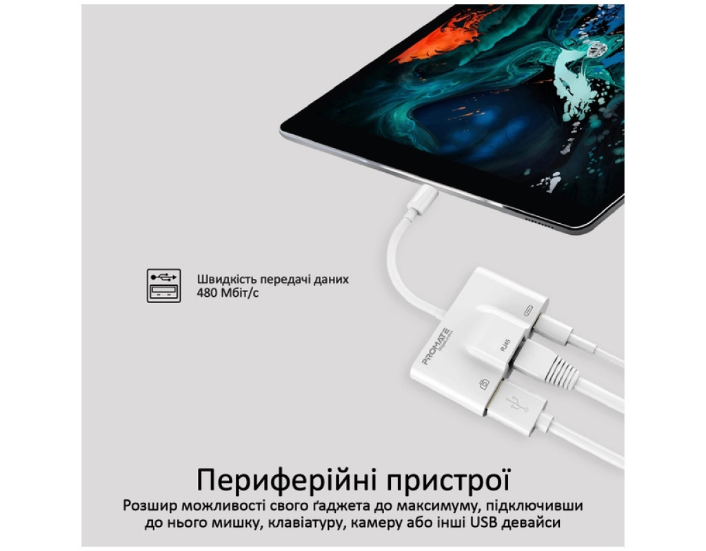 Насолоджуйся стабільним та швидким дротовим інтернетом, підключай периферійні пристрої, синхронізуй дані та одночасно заряджай свій iPhone або iPad c Promate GigaLink-i. Особливості: - USB 3.0 OTG порт: Передавай та синхронізуй дані на швидкості 480 Мбіт/с.