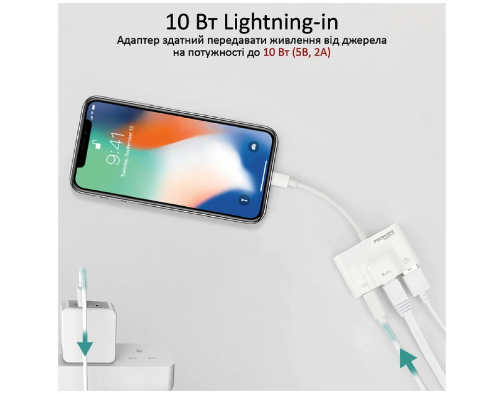 - 10 Вт Lightning-in: Адаптер здатний передавати живлення від джерела на потужності до 10 Вт.