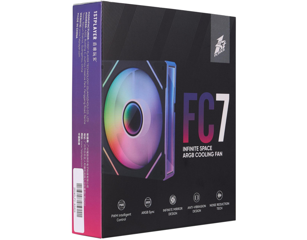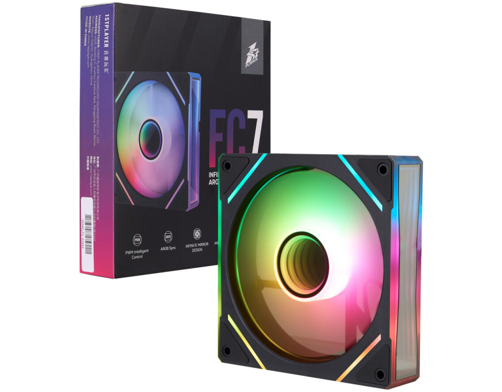 | 1stPlayer FC7 - 9-лопатевий вентилятор, який забезпечує тиху роботу. Конструктивно закладена антивібраційна система кріплення для зниження шуму. Вентилятор підтримує синхронізацію ARGB для узгоджених світлових ефектів. Особливістю 1stPlayer FC7 є дизайн безкінечного дзеркала для чудового візуального ефекту. |