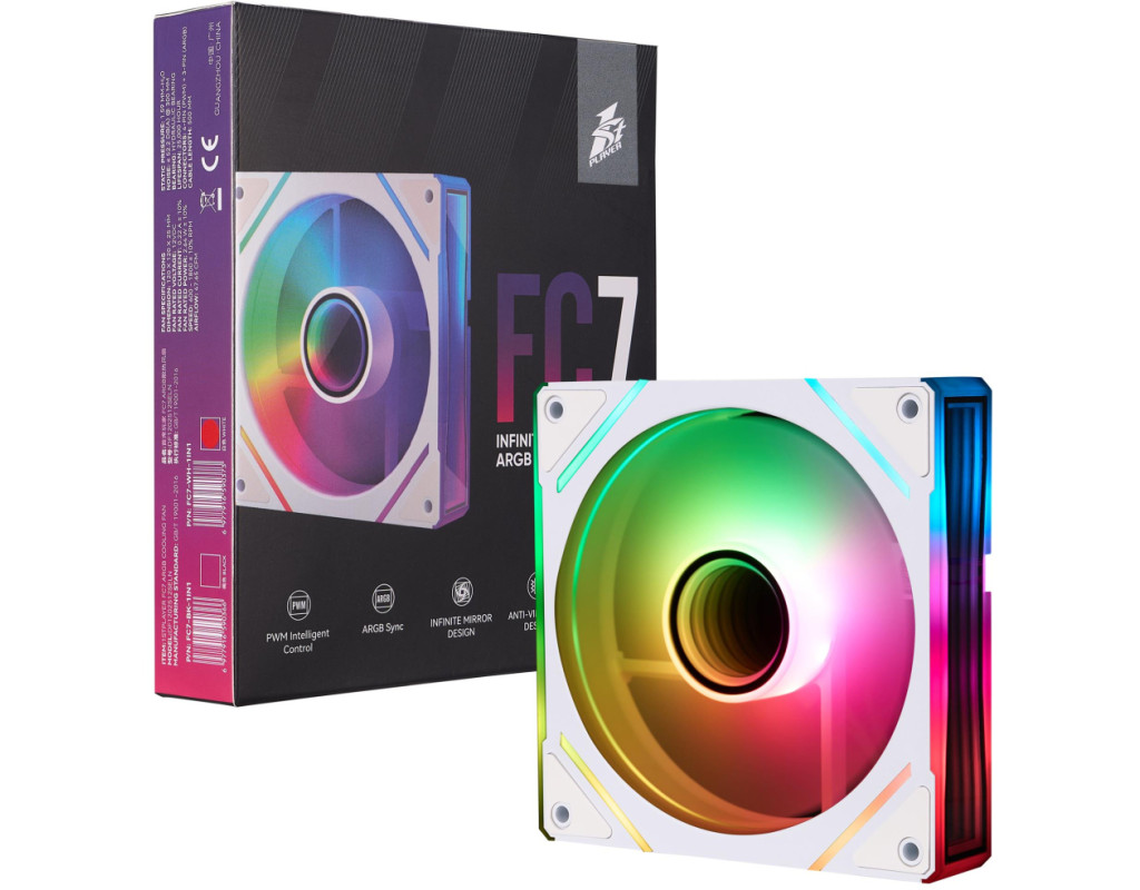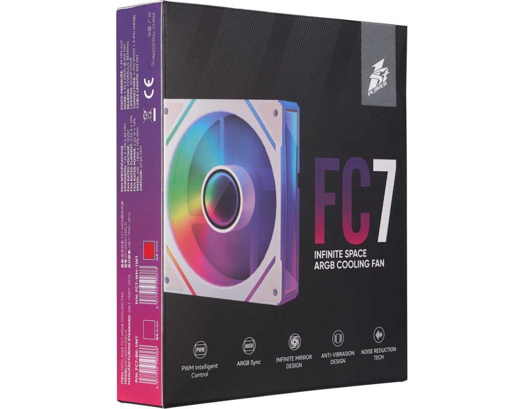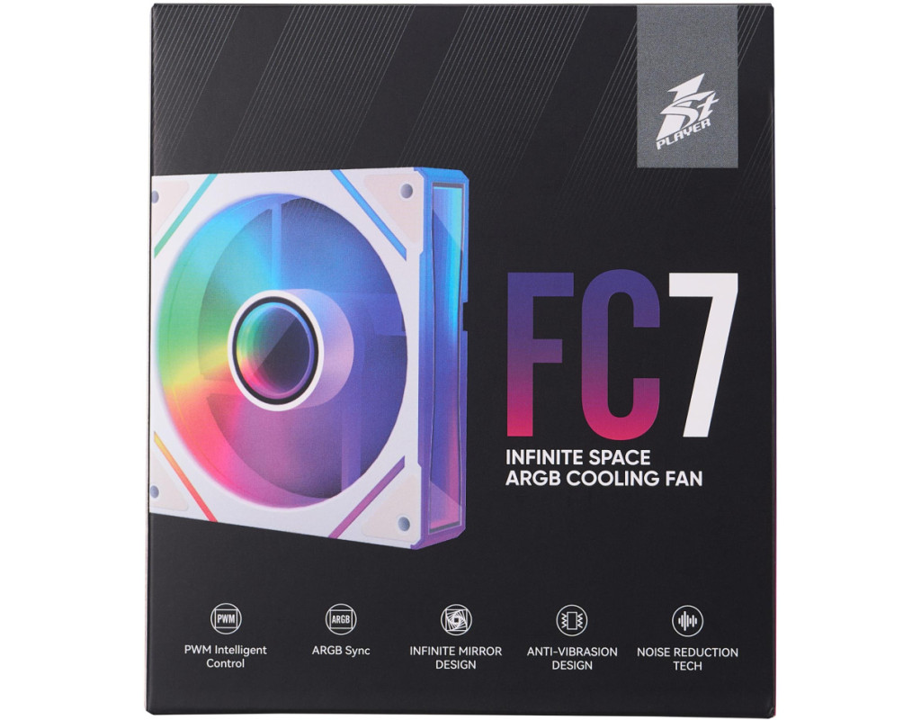 | 1stPlayer FC7 - 9-лопатевий вентилятор, який забезпечує тиху роботу. Конструктивно закладена антивібраційна система кріплення для зниження шуму. Вентилятор підтримує синхронізацію ARGB для узгоджених світлових ефектів. Особливістю 1stPlayer FC7 є дизайн безкінечного дзеркала для чудового візуального ефекту. |
