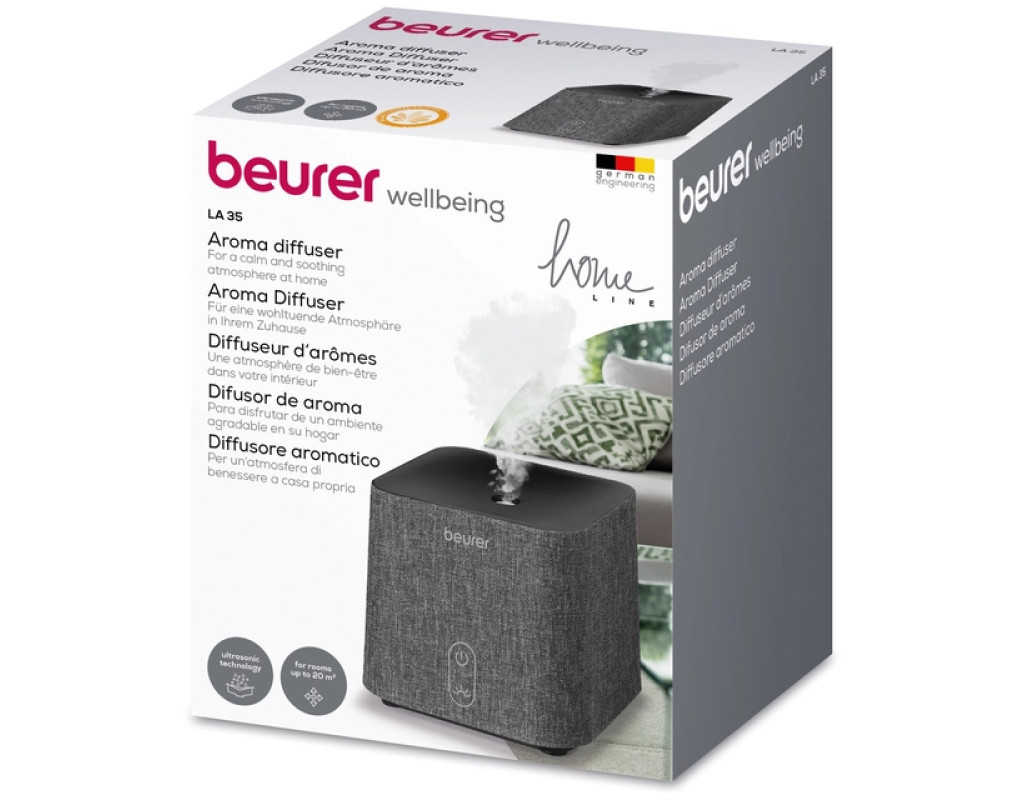 Ультразвуковий освіжувач повітря Beurer LA 35 відрізняється стильним дизайном з благородним тканинним оздобленням та створює затишну атмосферу в будинку. За допомогою водорозчинних ефірних олій він ароматизує приміщення площею до 20 м2, практично не шумить і споживає мало енергії.