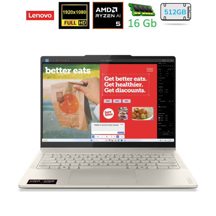 14", 1920x1200 (WUXGA), OLED, AMD Ryzen AI 5 340 (2.0 - 4.8 ГГц), 16 ГБ, SSD - 512 ГБ, AMD Radeon 840M, без операційної системи, 70 Втг, сенсорний екран, підсвічування клавіатури, зарядка від USB, стилус, українська клавіатура, 1.38 кг, бежевий