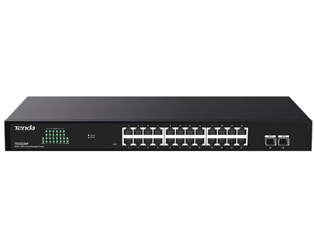 | TEG2226F — це 24-портовий інтелектуальний комутатор хмарного управління Gigabit+2SFP, незалежно розроблений компанією Tenda. Він підтримує керування хмарною веб-платформою та керування через додаток ClouFi. Він може автоматично обнаруживать петли і частні маршрутизатори, а також відправляти сигнали тривоги. Обслуговування мережі стає більш ефективним, витрати на післяпродажне обслуговування знижуються, а комутатори можна налаштувати, не виходячи з дому. |