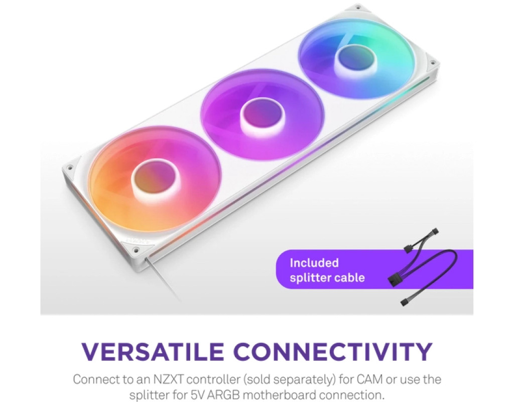 | Однорамні вентилятори NZXT серії F RGB Core безперешкодно інтегруються з кількома вентиляторами для легкого встановлення, забезпечуючи чудове охолодження, надзвичайно тиху роботу та вражаючу RGB-візуалізацію. Однокорпусний блок з вбудованими вентиляторами спрощує встановлення, налаштування та керування освітленням — немає потреби підключати окремі вентилятори. Просто підключіть один кабель до контролера NZXT (продається окремо) для керування підсвічуванням та швидкістю за допомогою програмного забезпечення NZXT CAM. Або підключіться до будь-якого роз'єму 5 В ARGB материнської плати за допомогою доданого розгалужувача. Конструкція лопатей вентилятора підвищує статичний тиск, проштовхуючи повітря крізь вузькі простори, забезпечуючи оптимальний повітряний потік. Підходить як для впуску, так і для витяжки. Гідродинамічні підшипники забезпечують тиху та стабільну роботу протягом виняткового терміну служби 60000 годин. Вісім індивідуально адресованих RGB-світлодіодів на кожному вентиляторному концентраторі розсіюються через напівпрозорі лопаті для створення яскравих барвистих візуальних ефектів. Вентилятори з PWM-керуванням динамічно регулюють швидкість обертання залежно від температури ПК для оптимальної ефективності та зниження шуму. Антивібраційні гумові кутники ефективно усувають шум, спричинений вібраціями, забезпечуючи тиху роботу на будь-якій швидкості. |