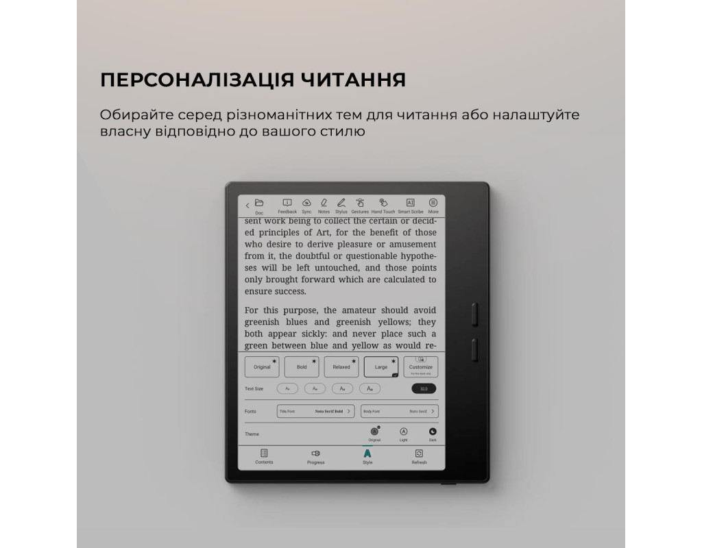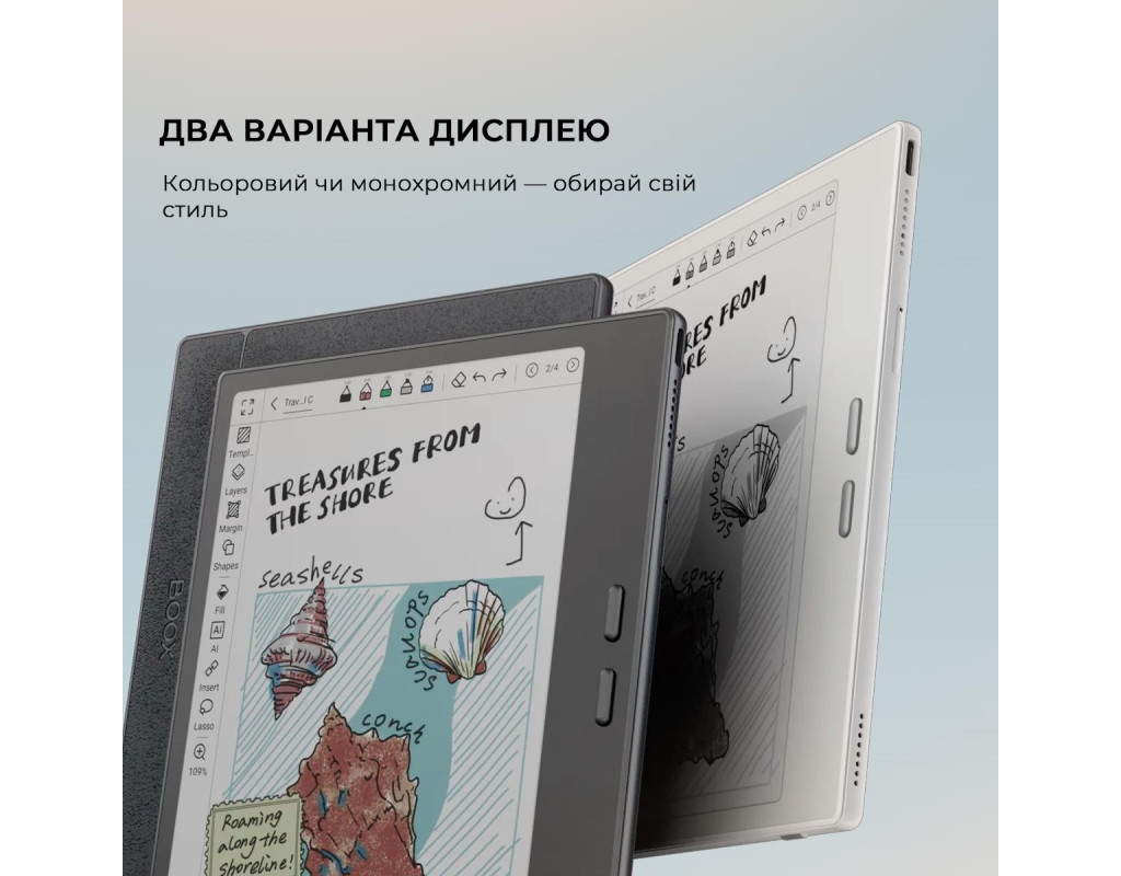 Неперевершене відчуття паперу Легко робіть швидкі нотатки Нескінченні розваги з додатками для Android Вся ваша бібліотека в одному місці Зручне використання з фізичними кнопками Що таке E Ink Kaleido 3? Екрани E Ink Kaleido 3 відображають 4096 кольорів у кольоровому режимі та 16 відтінків сірого у чорно-білому режимі. Оптимізація структури дисплея дозволила нам збільшити насиченість кольорів на 30% порівняно з попереднім поколінням. E Ink Kaleido 3 використовує технологію E Ink Print Color ePaper, в якій масив кольорових фільтрів (CFA) доповнює основу E Ink Carta 1200, відображаючи повноколірне зображення. Переднє підсвічування екрана Технологія MOON Light 2 дозволяє використовувати пристрій у темряві або за умов поганого освітлення без шкоди для зору. При використанні цієї функції створюється м’яке світіння екрана, оптимальне для читання в темних приміщеннях. Ця система переднього підсвічування має регулювання колірної температури, а завдяки технології Flicker-Free мерехтіння екрана повністю усувається. Що таке MOON Light 2? Найновіші дослідження показали, що синє світло перешкоджає виробленню мелатоніну (регулятора добових ритмів), який необхідний людині для сну. Тому після читання на екрані звичайного планшета чи смартфона часто важко заснути. MOON Light 2 дозволяє незалежно регулювати яскравість холодного та теплого світлодіодного підсвічування, вибираючи за бажанням біле світло для читання вдень та більше жовтого для читання перед сном. Збільшена діагональ екрана Екран ONYX BOOX Go Color 7 (Gen II) збільшений до 7 дюймів і відображає на 30% більше інформації, ніж аналогічні 6-дюймові пристрої. Водночас пристрій достатньо компактний для комфортного використання під час подорожей. Функція автоматичного повороту екрана Вбудований G-сенсор автоматично вибирає правильну орієнтацію тексту під час повороту пристрою. Завдяки цій опції ви можете змінити орієнтацію електронної книги, і зображення буде автоматично переструктуровано. Кнопки перегортання сторінок на правій стороні пристрою також змінюють свої функції відповідно до орієнтації екрана. Висока продуктивність 8-ядерний процесор з тактовою частотою 2 ГГц разом із 4 ГБ оперативної пам’яті забезпечують комфортну роботу з будь-якими, навіть найскладнішими документами, а 64 ГБ енергонезалежної пам’яті разом зі слотом для карт microSD дозволяють зберігати велику бібліотеку улюблених книг. Блютуз Завдяки вбудованому модулю Bluetooth 5.1 ви можете підключати зовнішні пристрої. OTG Пристрій підтримує OTG, завдяки чому можна підключати додаткові периферійні пристрої, які не потребують драйверів. Підтримка форматів Програмне забезпечення BOOX дозволяє відкривати низку різних форматів текстових та графічних файлів. Під час читання ви можете змінювати стиль та розмір шрифту, розташування сторінок, додавати закладки та масштабувати документи за власним бажанням. Аудіоплеєр та TTS Пристрій має попередньо встановлений аудіоплеєр, який дозволяє слухати музику або аудіокниги. Щоб ним скористатися, просто запустіть відповідний аудіофайл дотиком пальця. Також ви можете під’єднати навушники або зовнішні динаміки через Bluetooth або через роз’єм USB Type C. Пристрій підтримує функцію TTS (Text-To-Speech), яку можна використовувати для озвучування текстових файлів. Легкий запис контенту Поряд зі стандартним способом копіювання файлів на пристрій за допомогою USB-кабелю, д