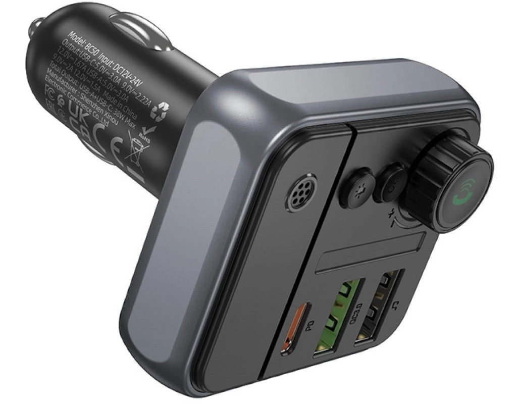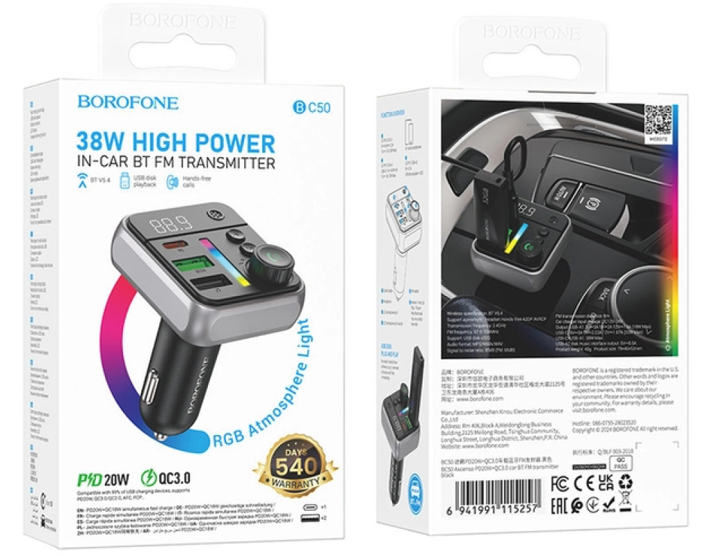 BOROFONE BC50 – це високотехнологічний FM-трансмітер, який розширює мультимедійні можливості автомобіля та забезпечує швидке заряджання портативних гаджетів. У поєднанні зі штатним FM-приймачем він дозволяє: