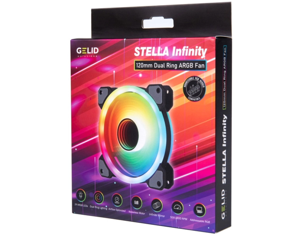 Stella Infinity від Gelid Solutions – це ідеальне поєднання передових технологій та яскравого дизайну. Він оснащений 8 світлодіодами ARGB, встановленими на концентраторі, та 16 незалежними світлодіодами ARGB, встановленими на рамі. Світлодіоди забезпечують стильне подвійне кільцеве підсвічування. Дзеркало Infinity у центрі вентилятора у поєднанні зі світлодіодним кільцем створює ілюзію чорної діри. Вентилятор також оснащений гідродинамічним підшипником для підвищеної надійності та оптимізованою крильчаткою для покращення повітряного потоку. Яскраве підсвічування, міцна конструкція та безшумна робота роблять Stella Infinity гідним доповненням до ігрових ПК. |