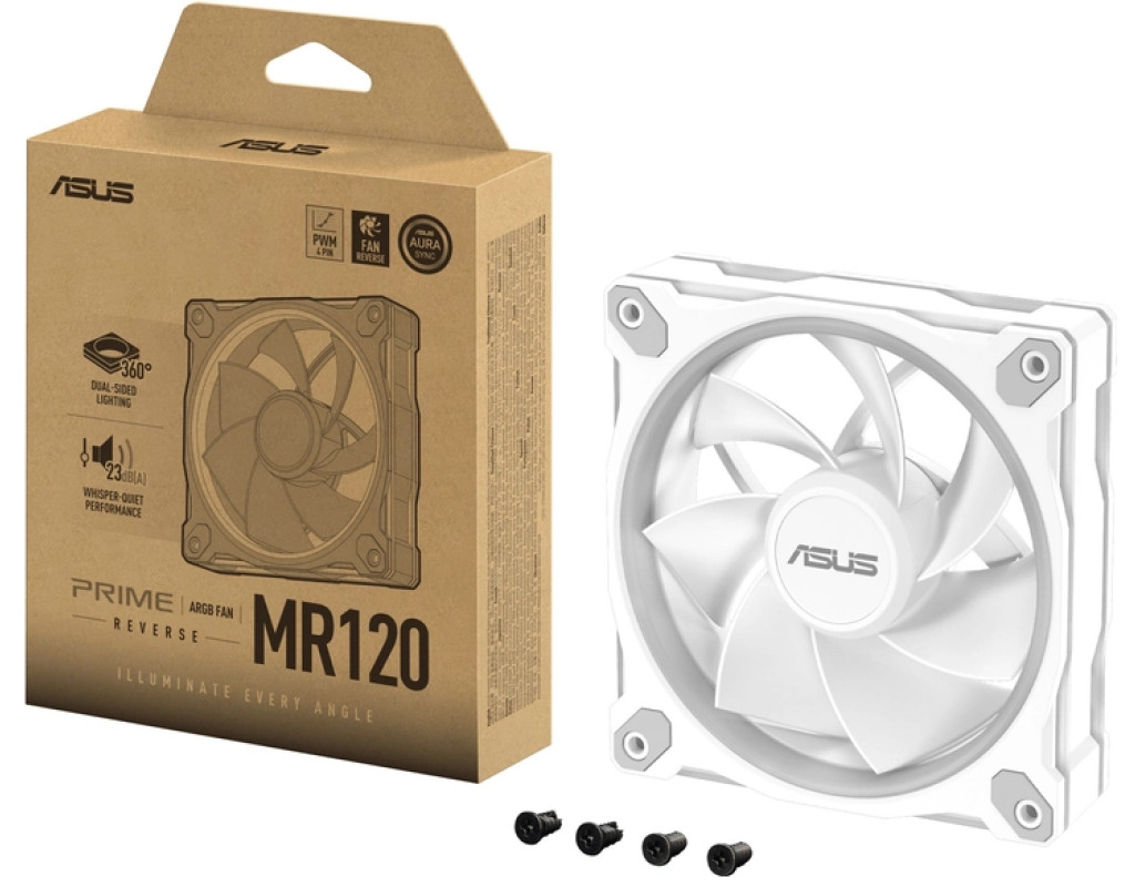 Вентилятор ASUS Prime MR120 ARGB Reverse з двостороннім підсвічуванням на рамі та товщиною 28 мм забезпечує ідеальну ефективність охолодження.