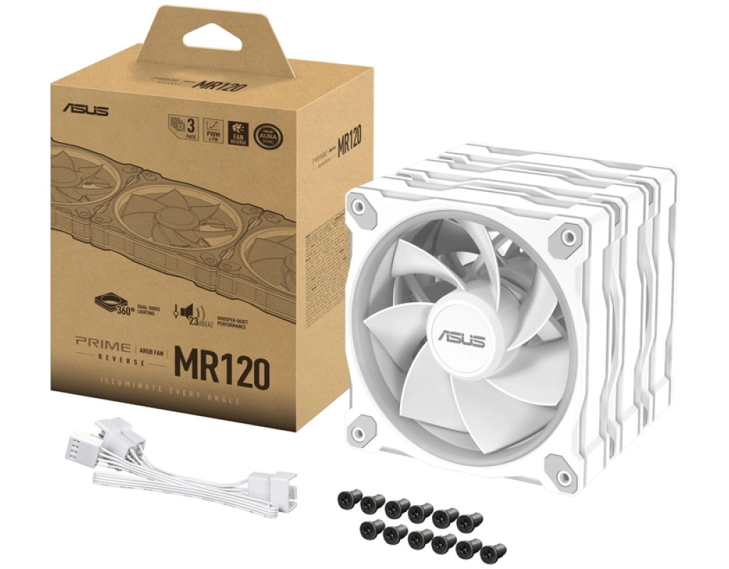 Вентилятор ASUS Prime MR120 ARGB Reverse з двостороннім підсвічуванням на рамі та товщиною 28 мм забезпечує ідеальну ефективність охолодження.