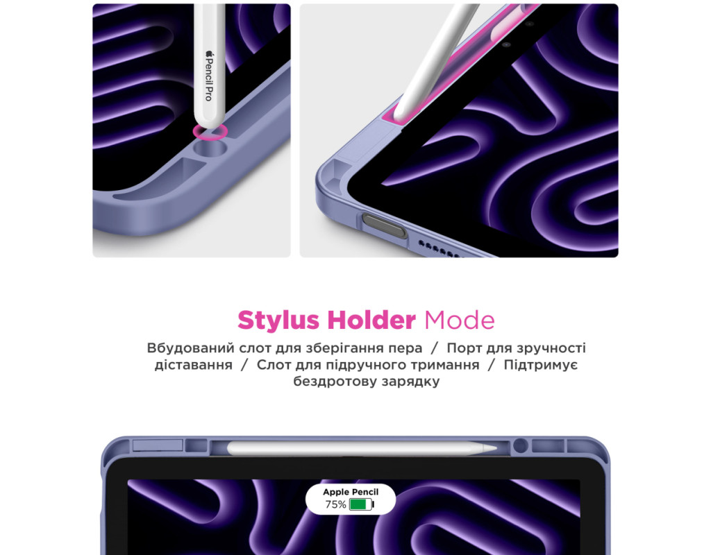 Чохол ArmorStandart Y-Type PEN для iPad поєднує захист і функціональність, створений для зручного використання планшета в будь-яких умовах. Вбудований слот для стилуса забезпечує безпечне зберігання Apple Pencil, щоб він завжди був під рукою. Завдяки продуманій конструкції чохол легко трансформується у підставку з двома оптимальними кутами огляду, ідеальними для відеодзвінків у FaceTime або перегляду фільмів. Це забезпечує зручність під час використання планшета як для роботи, так і для відпочинку. Чохол також підтримує функцію Wake/Sleep, яка автоматично пробуджує планшет під час відкриття та переводить його у режим сну після закриття, що зберігає заряд батареї. Матеріали, з яких виготовлений чохол, забезпечують надійний захист планшета. Передня панель виконана з якісної PU шкіри, що приємна на дотик і стійка до зносу. Прозора задня спинка з акрилу не лише захищає пристрій, але й дозволяє демонструвати оригінальний дизайн планшета, а бокові сторони з гнучкого TPU забезпечують додаткову амортизацію при ударах. Особливості: