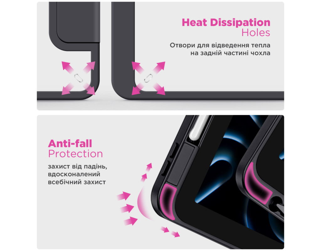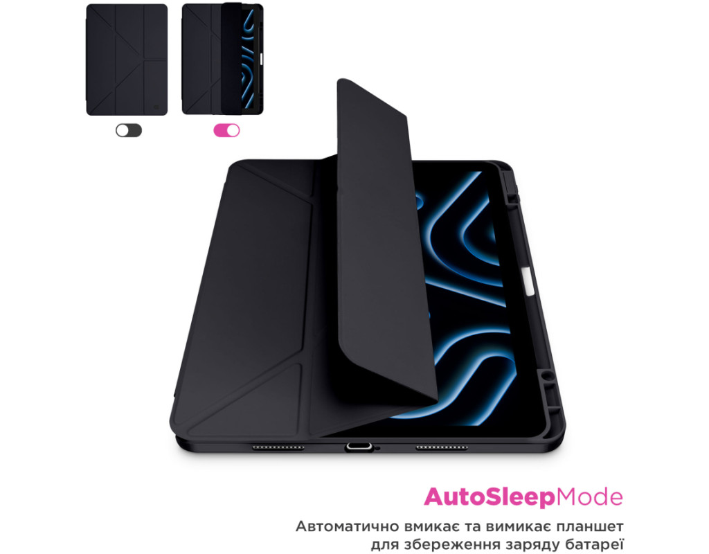 Чохол ArmorStandart Y-Type PEN для iPad поєднує захист і функціональність, створений для зручного використання планшета в будь-яких умовах. Вбудований слот для стилуса забезпечує безпечне зберігання Apple Pencil, щоб він завжди був під рукою. Завдяки продуманій конструкції чохол легко трансформується у підставку з двома оптимальними кутами огляду, ідеальними для відеодзвінків у FaceTime або перегляду фільмів. Це забезпечує зручність під час використання планшета як для роботи, так і для відпочинку. Чохол також підтримує функцію Wake/Sleep, яка автоматично пробуджує планшет під час відкриття та переводить його у режим сну після закриття, що зберігає заряд батареї. Матеріали, з яких виготовлений чохол, забезпечують надійний захист планшета. Передня панель виконана з якісної PU шкіри, що приємна на дотик і стійка до зносу. Прозора задня спинка з акрилу не лише захищає пристрій, але й дозволяє демонструвати оригінальний дизайн планшета, а бокові сторони з гнучкого TPU забезпечують додаткову амортизацію при ударах. Особливості: