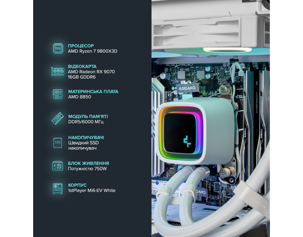 Персональний комп`ютер ASGARD Ran (A98X3D.64.S15.97.5798); AMD Ryzen 7 9800X3D (4.2 - 5.7 ГГц) / ОЗП 64 ГБ / SSD 1.5 ТБ / AMD Radeon RX 9070 16 ГБ / без ОП / LAN / Wi-Fi / Bluetooth / Fedora / білий