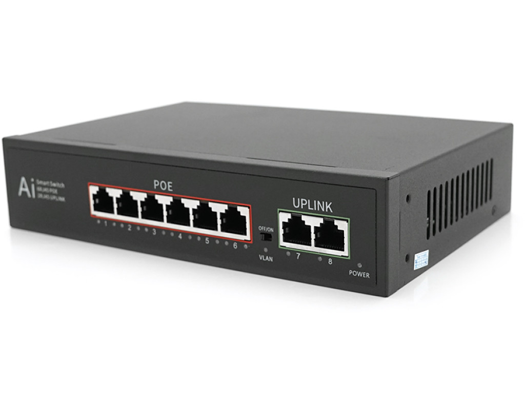 | POE комутатор Merlion 6 POE 10 / 100 + 2 RJ45 10 / 100 вбудований блок живлення 52V 1.45A |