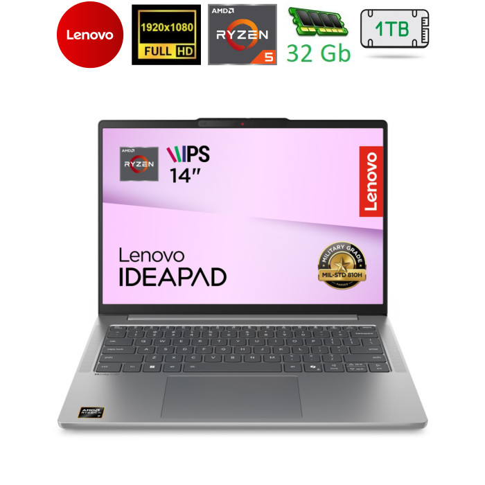 14", 1920x1200 (WUXGA), IPS, 300nits, AMD Ryzen 5 7535HS (3.3 - 4.55 ГГц), 32 ГБ, SSD - 1 ТБ, UHD Graphics 13th Gen, без операційної системи, 60 Втг, підсвічування клавіатури, зарядка від USB, українська клавіатура, 1.47 кг, сірий
