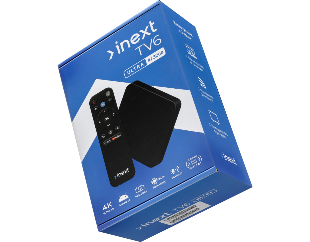 inext TV6 Ultra — максимум можливостей для максимуму контенту inext TV6 Ultra — це розширена версія inext TV6, яка отримала вдвічі більше оперативної пам’яті (4 ГБ) та накопичувача (32 ГБ). Це означає швидшу роботу, плавніше відео, ще більше можливостей для встановлення додатків та зберігання даних. Продуктивність без обмежень: