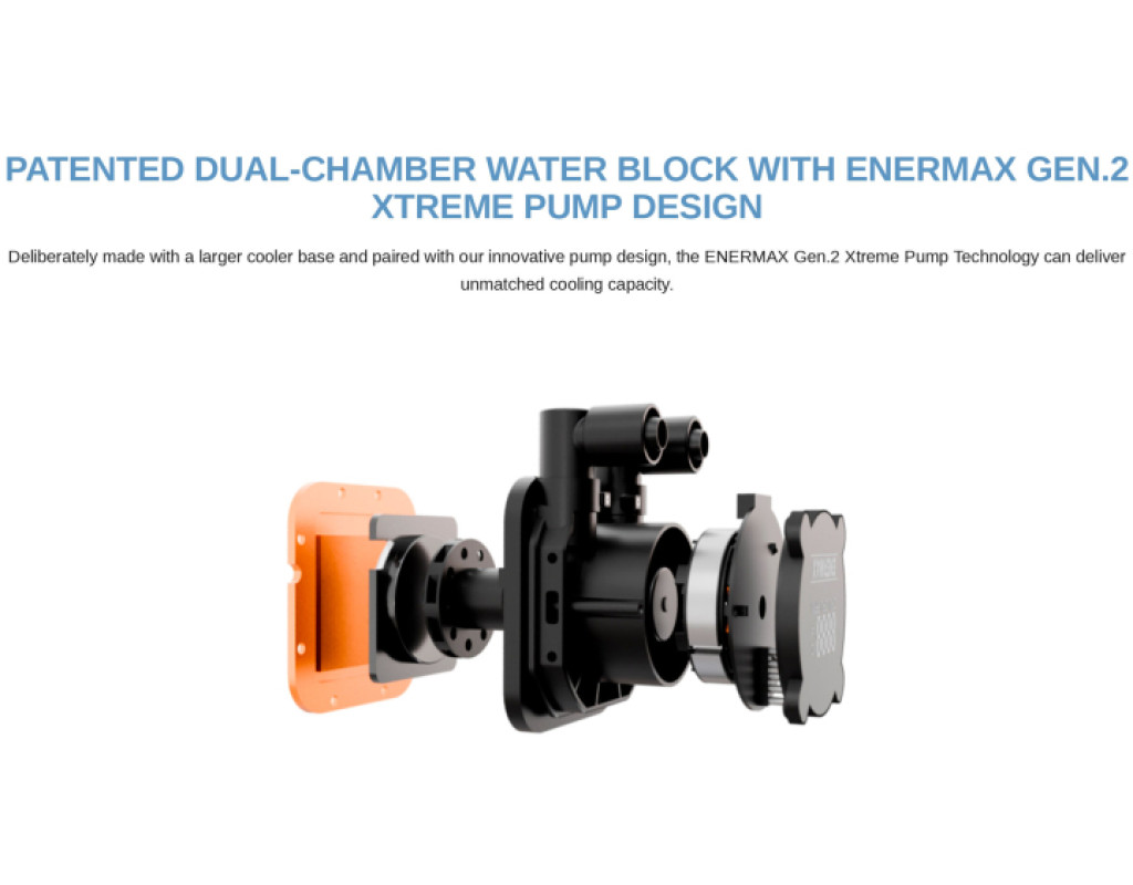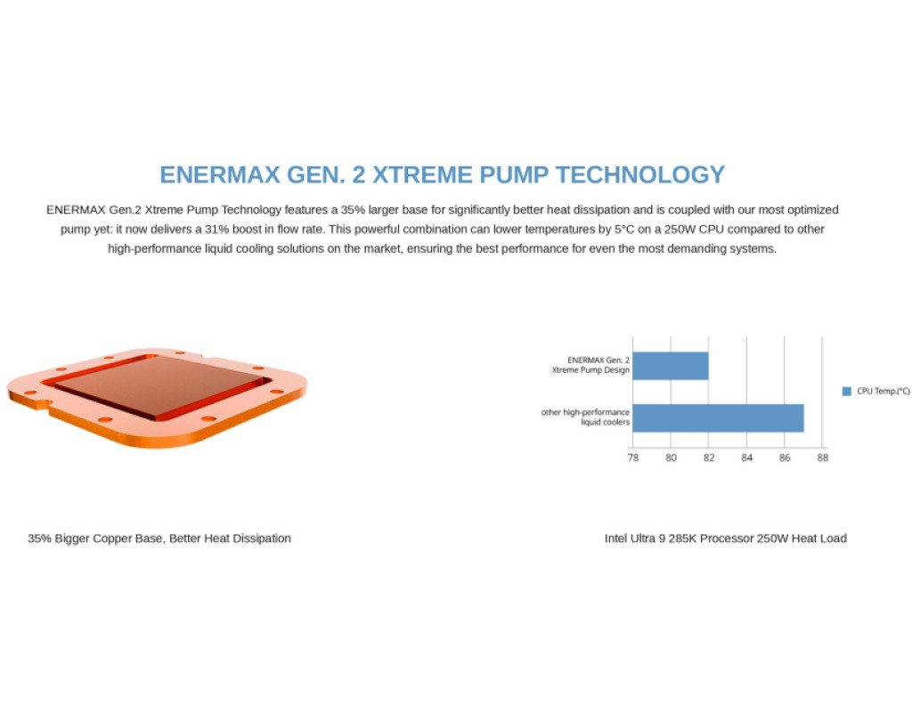 Запатентований двокамерний водоблок з помпою Gen.2 Xtreme Завдяки збільшеній на 35% основі та оптимізованій конструкції помпа забезпечує на 31% вищий потік рідини, що дозволяє знизити температуру процесора на 5°C (TDP 250 Вт) у порівнянні з іншими високопродуктивними СРО.