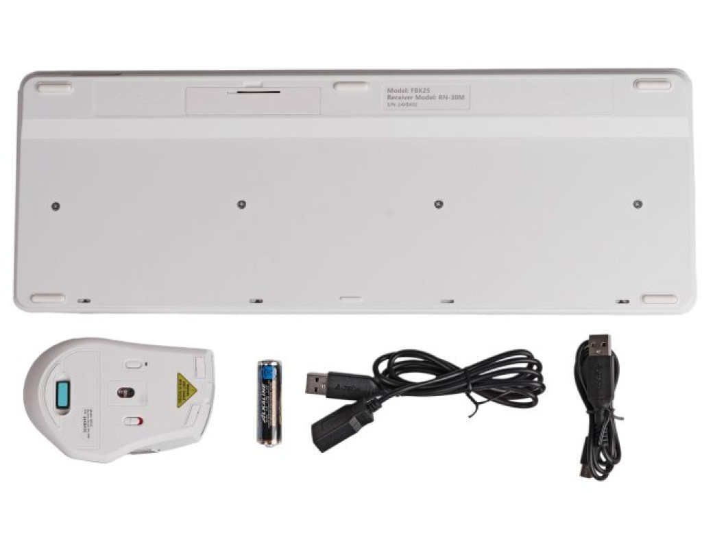 • У комплекті: клавіатура, миша, нано-ресивер, 1 лужна батарея AA, подовжувальний USB-кабель, зарядний кабель Type-C, посібник користувача