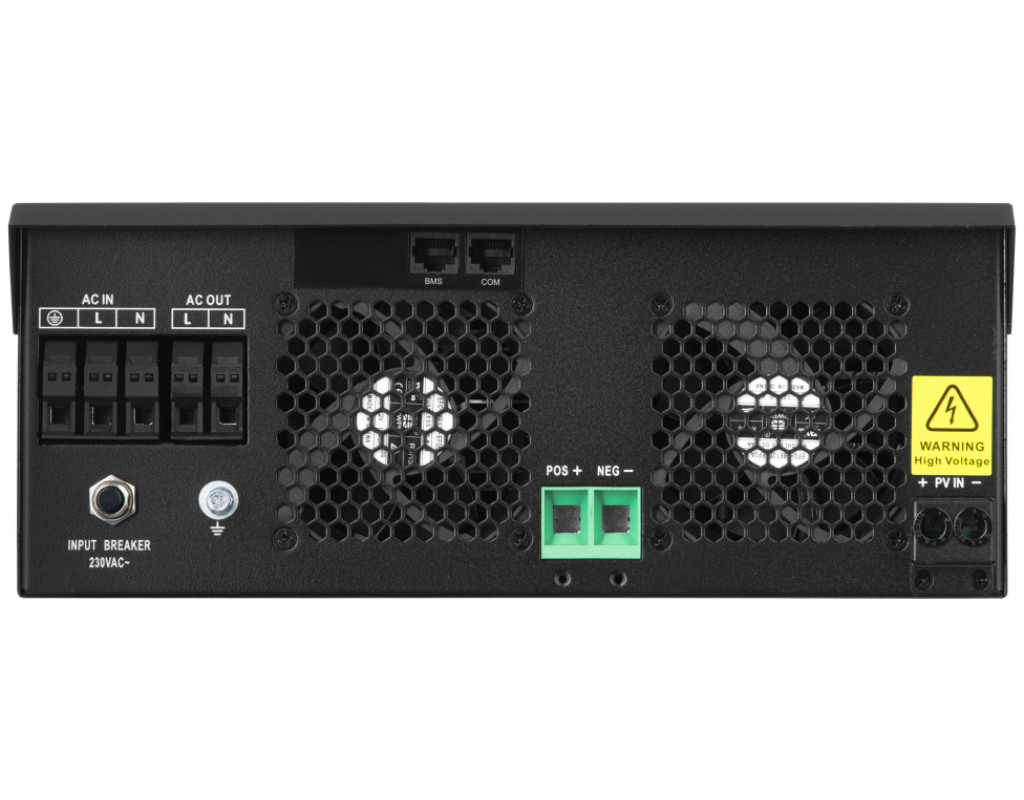 Гідна потужність Цей автономний інвертор із максимальною потужністю 5 000 ВА/5 000 Вт розроблено для забезпечення безперебійної та стабільної роботи системи енергоживлення. Такий пристрій стане вдалим рішенням для тих, хто прагне незалежності від традиційних електромереж і використовує сонячну енергію як основне джерело живлення. Інноваційна технологія Hi-voltage MPPT Інвертор оснащено вбудованим мережевим і високовольтним сонячним MPPT, який ефективно оптимізує заряджання, адаптуючись до мінливих погодних умов. Вікно MPPT із діапазоном 120–450 В постійного струму зумовлює можливість пристрою перетворювати струм до 18 А, а максимальна потужність фотомодулів становить 5 000 Вт. Така система гарантує ефективне поглинання сонячної енергії навіть за низької інтенсивності сонячного світла. Висока ефективність і швидке перемикання Завдяки ефективності 93 % 2E VM-5K48 забезпечує мінімальну втрату енергії. Інвертор швидко реагує на зміну джерел живлення: час перемикання становить лише 10 мс для комп’ютерного обладнання і 20 мс для побутової техніки. Це забезпечує захист від збоїв і стабільне живлення чутливої техніки. Зручне підключення та інтерфейси Модель оснащено інтерфейсами RS-232 та USB, що дає змогу легко інтегрувати пристрій у розумну систему керування або здійснювати моніторинг параметрів роботи. Це робить керування системою зручним і надійним. Зовнішня батарея Інвертор 2E VM-5K48 сумісний із зовнішньою батареєю з напругою 48VDC/54V-fc/63V-op. Завдяки цьому вдасться зберігати більше енергії та забезпечувати тривале живлення навіть за низької інтенсивності сонячного світла. Максимальний струм заряджання становить 100 А, тож швидке відновлення запасів енергії забезпечено. |